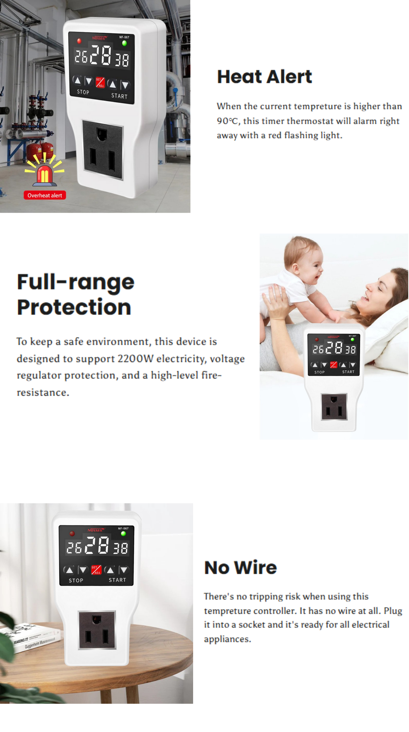- Built-in overheat alarm with heat-resistant housing for safety