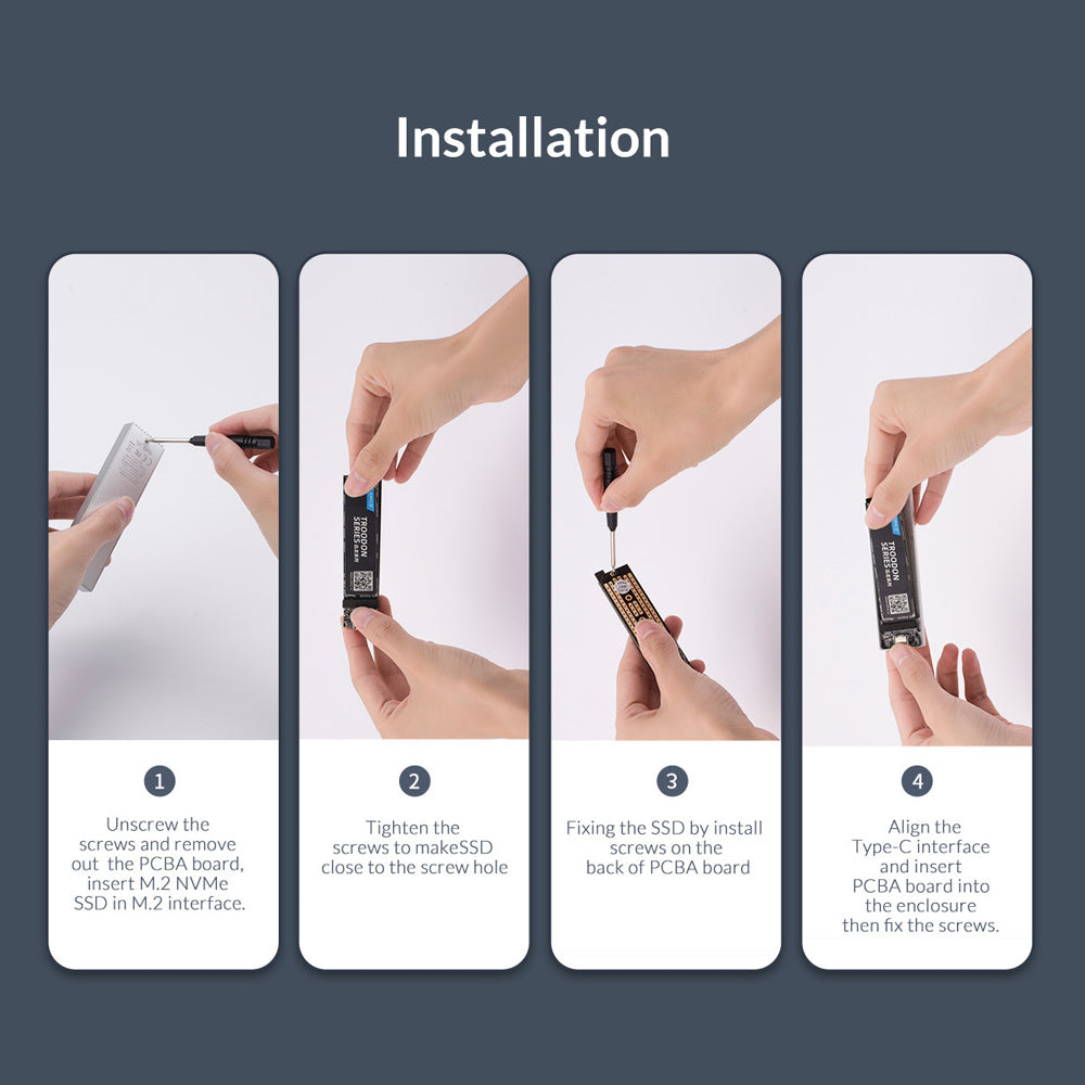1x NVME M.2 SSD Enclosure, 1x USB-A to USB-C Cable, 1x USB-C to USB-C Cable, 1x Screwdriver, 1x Silicone thermal pad