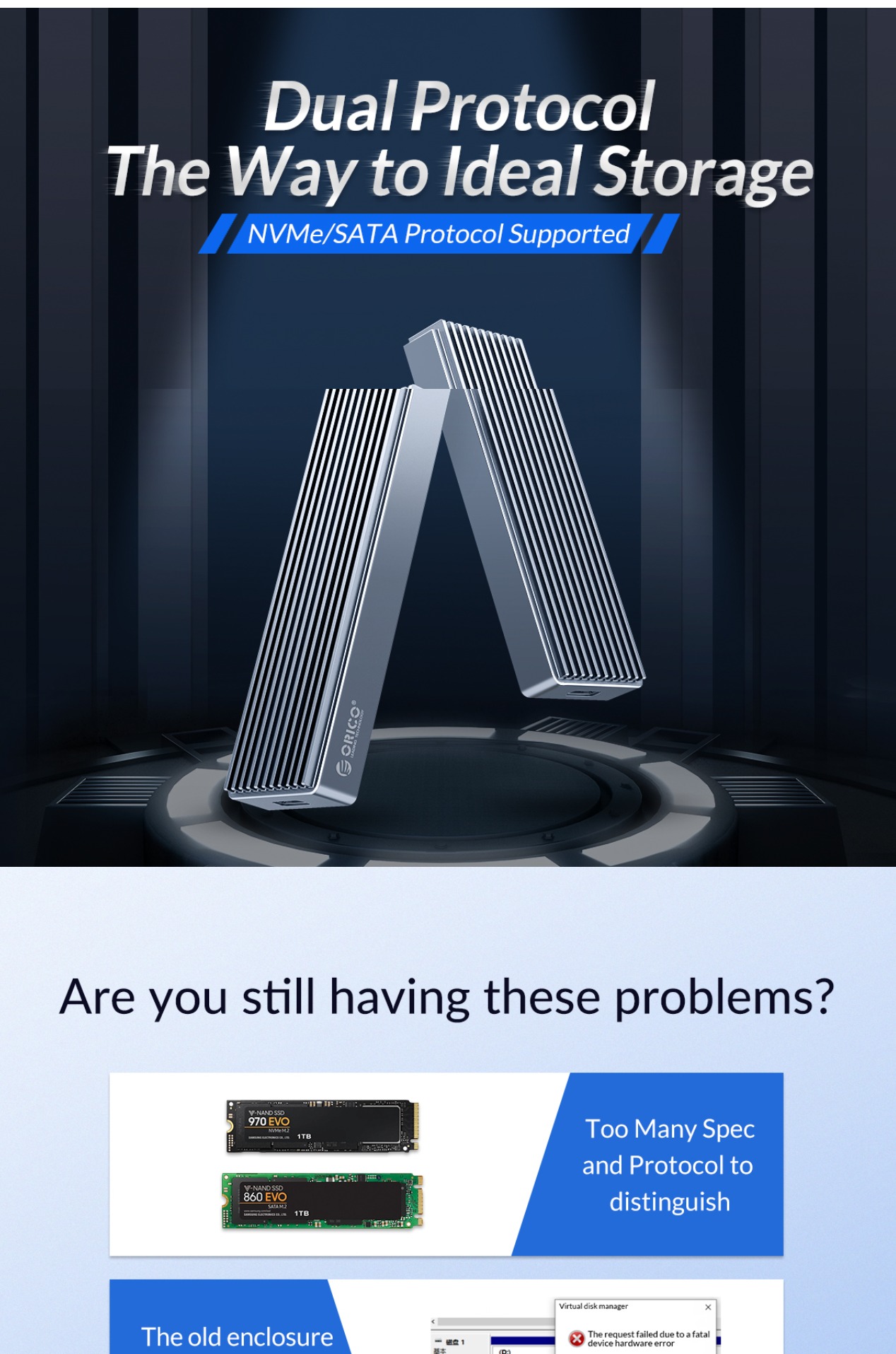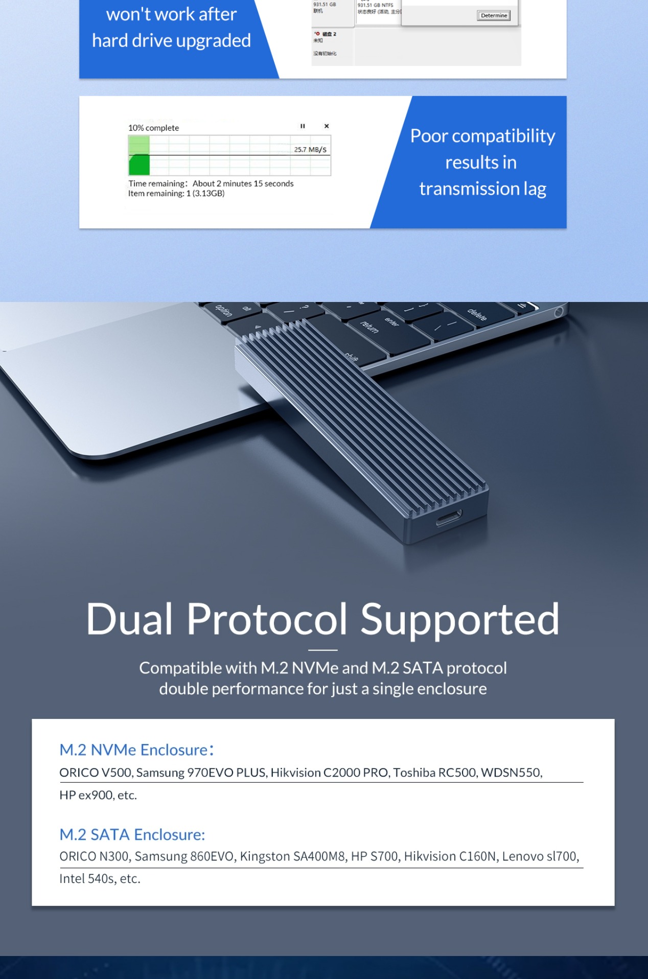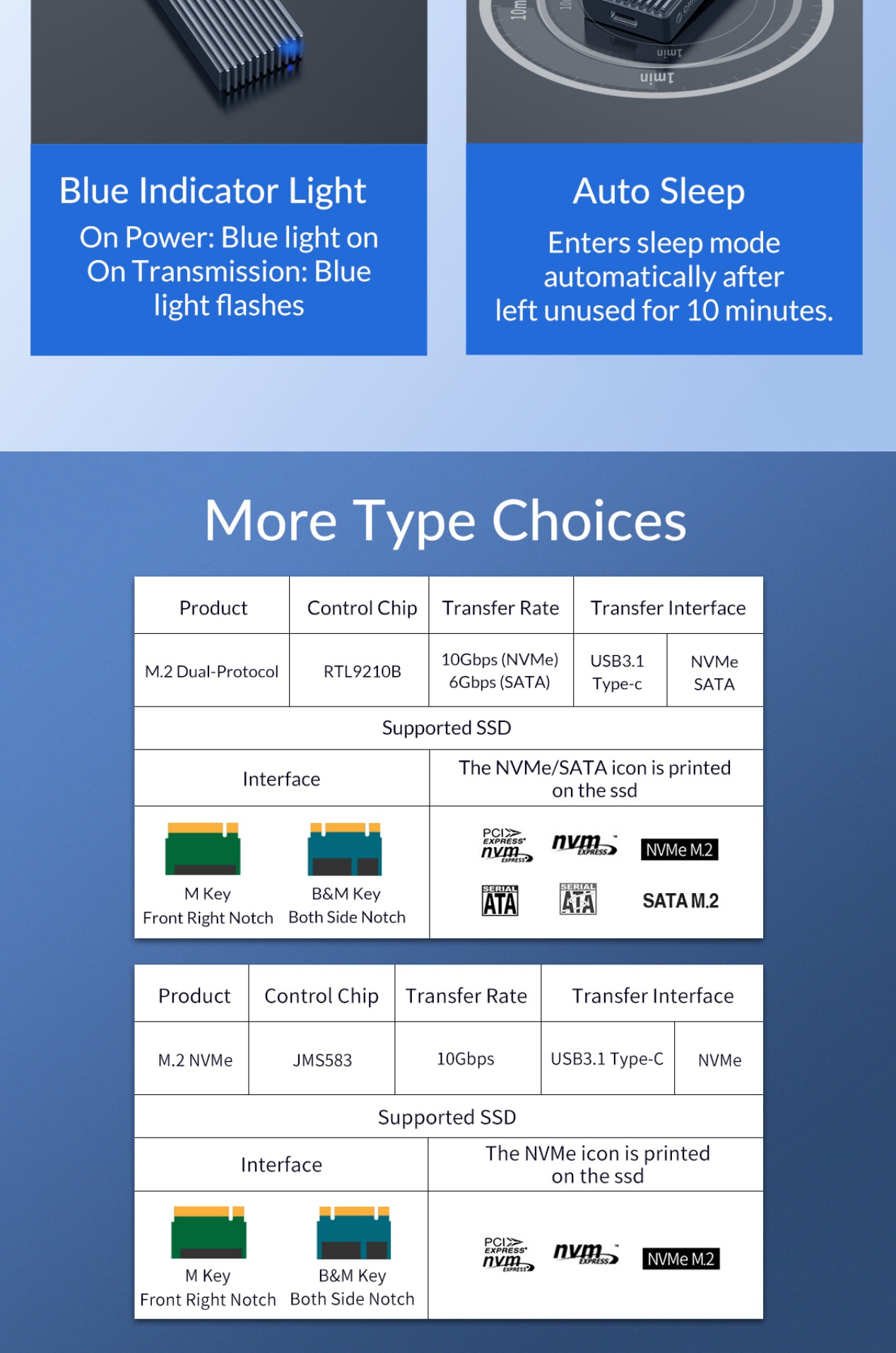 ORICO M.2 NVMe / SATA SSD to USB 3.1 Gen 2 Type-C Aluminum Solid State Drive Enclosure (M-key / M&B-key) with 10Gbps Speed, 2TB Supported Storage, and Support for Windows, macOS, and Linux for PCs, Desktop Computers, and Laptops