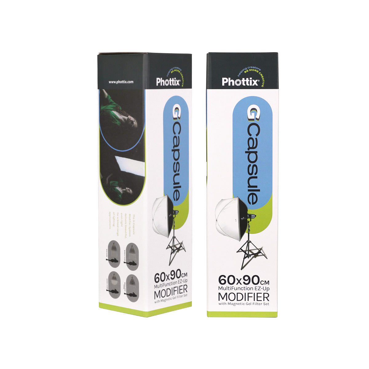 The G-Capsule series has black exterior, white interior surface, 4 and 16 fiberglass ribs structure. The fiberglass ribs are light yet robust and durable, and can be easily folded to save on storage space. The softbox comes with a carrying bag.
