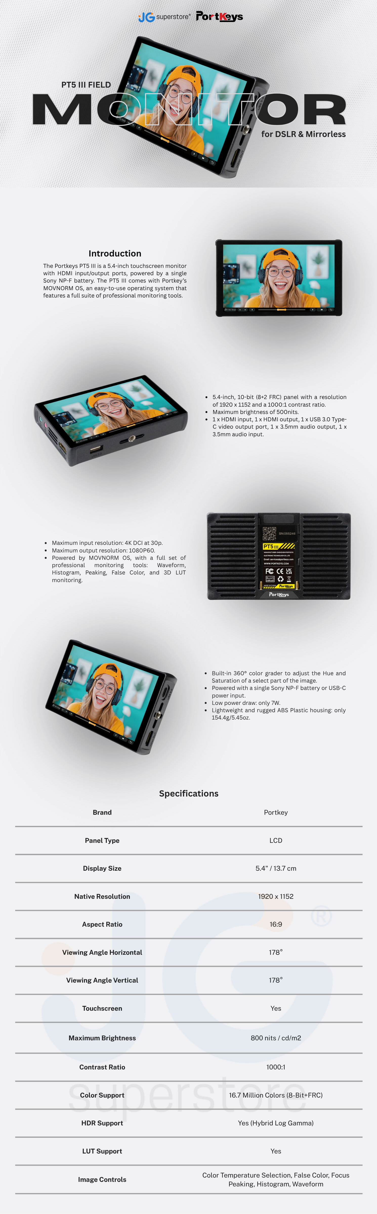 Image Controls: Color Temperature Selection, False Color, Focus Peaking, Histogram, Waveform