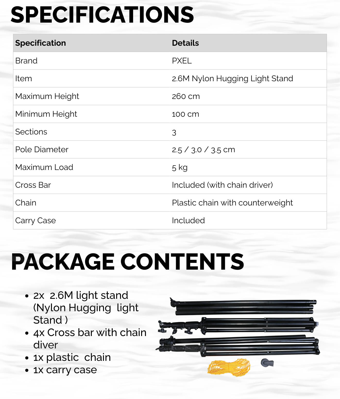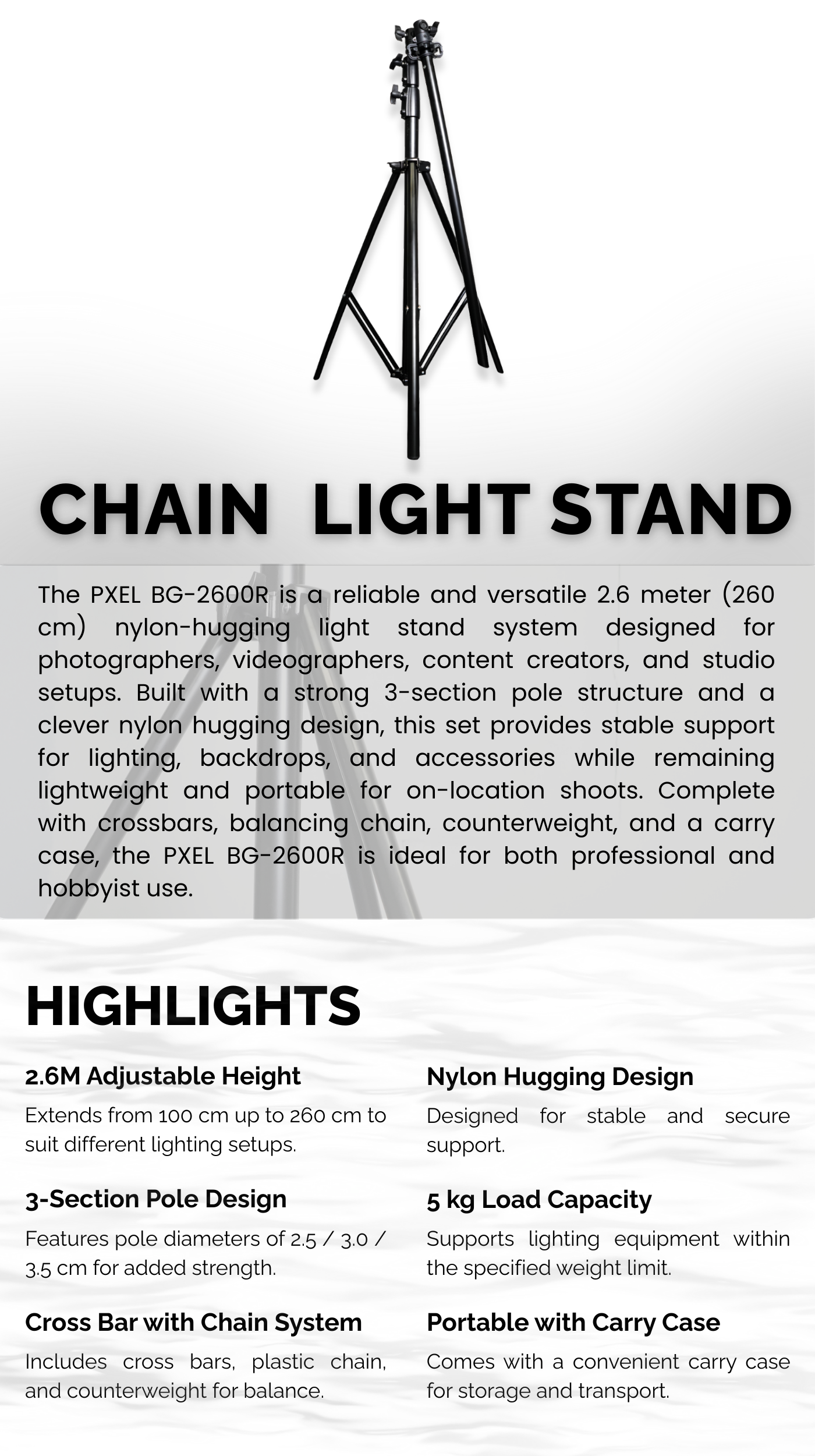 Pxel 2.6M Nylon Hugging Light Stand with Crossbar & Chain Drive, 3-Section Adjustable Stand