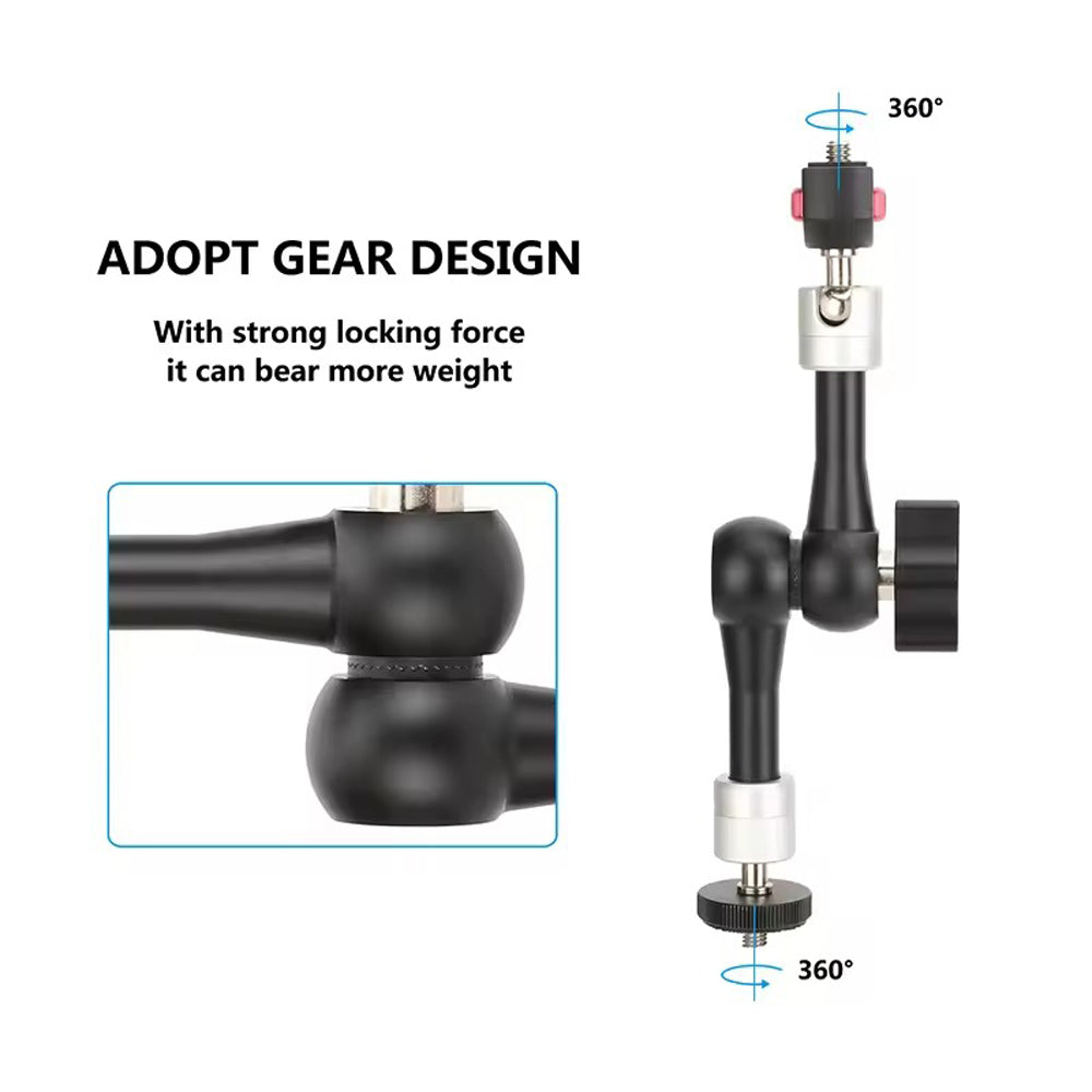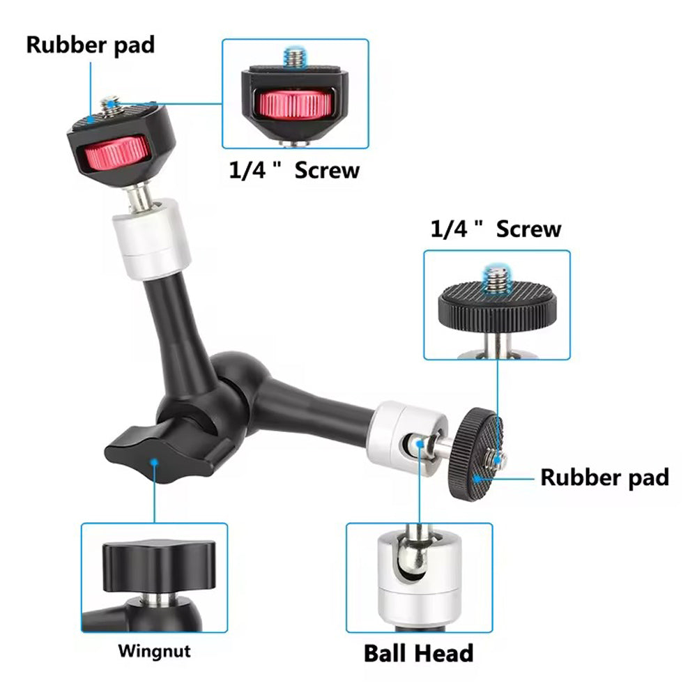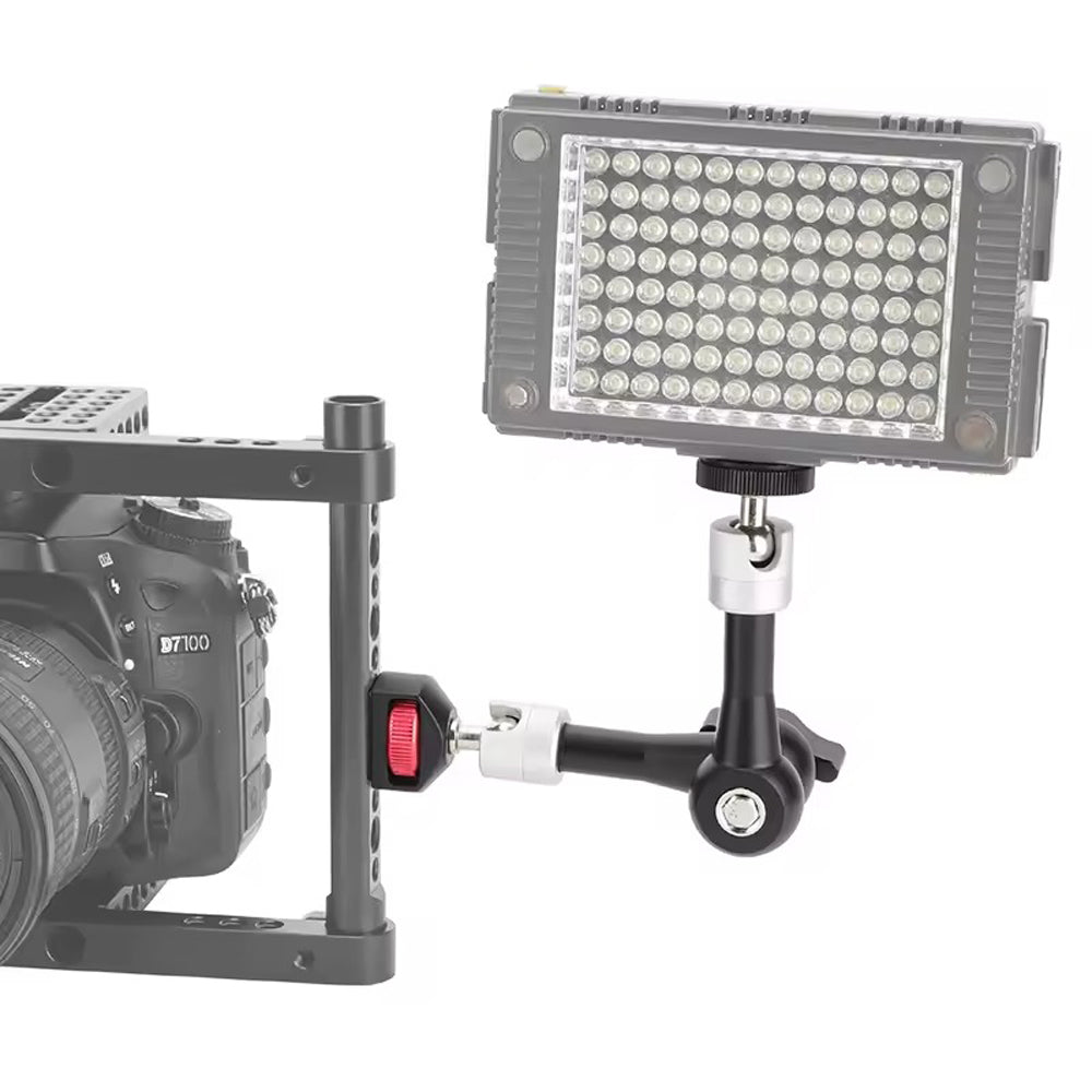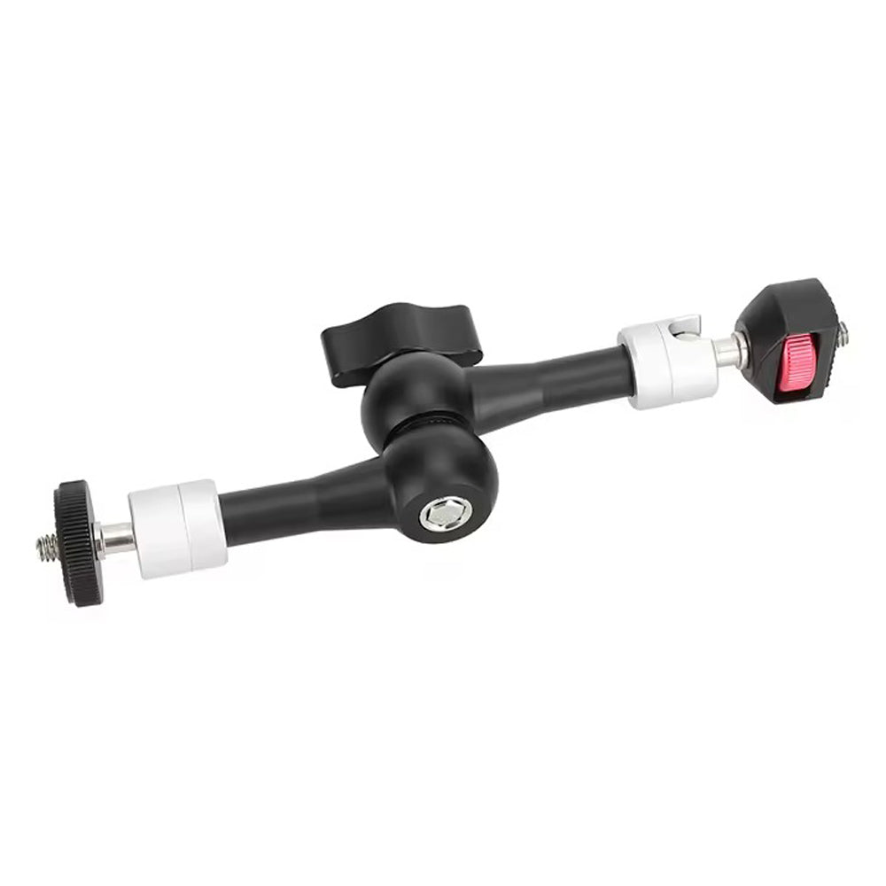 The PXEL AA-MA8 Articulating Magic Arm is a versatile and durable support solution designed for photography and videography. It features adjustable ball heads on both ends with 1/4"-20 threaded screws, making it compatible with various devices. With a maximum load capacity of 3.3lb (1.50kg), it securely holds your equipment in place. The arm includes a central locking lever to secure its three articulated joints, and rubber paddings to protect your devices. Made of durable aluminum alloy, this compact 7" arm offers reliable performance for various setups.