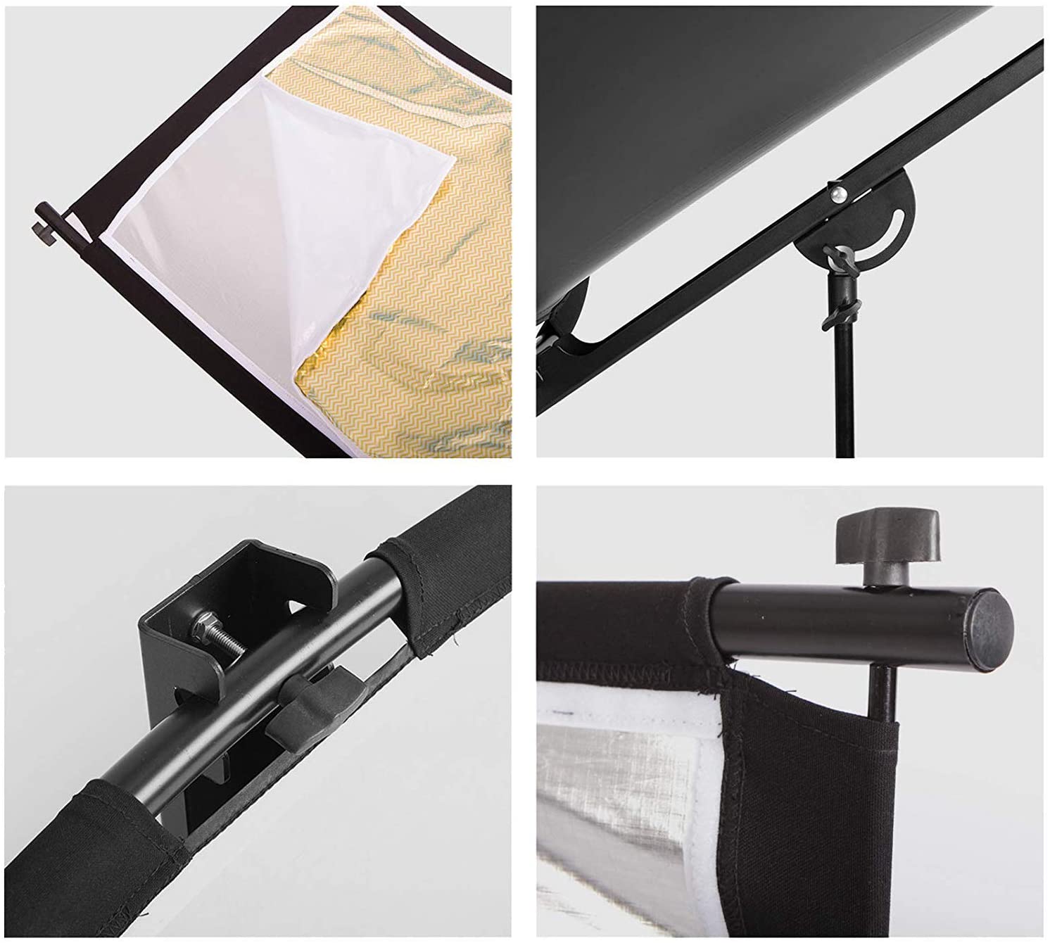 - High Quality Construction with Reflective Fabric - Made of strong aluminum alloy, highly reflective fabric incorporating 4 different color (white/Black/Silver/Gold). Durable and Versatile.