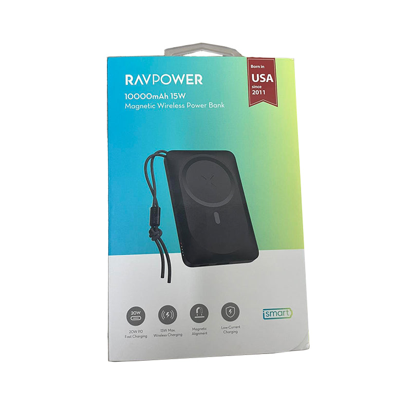 Ravpower magnetic wireless power bank with capacity 10000mAh capacity. Strong magnetic absorption, Compatible with the official magnetic phone case, Up to 15W fast wireless charging.