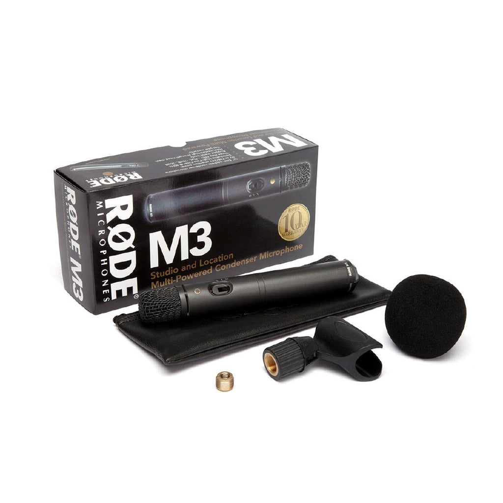 - The Rode M3 microphone can be powered by 24 to 48V phantom power or an internal 9V alkaline battery.