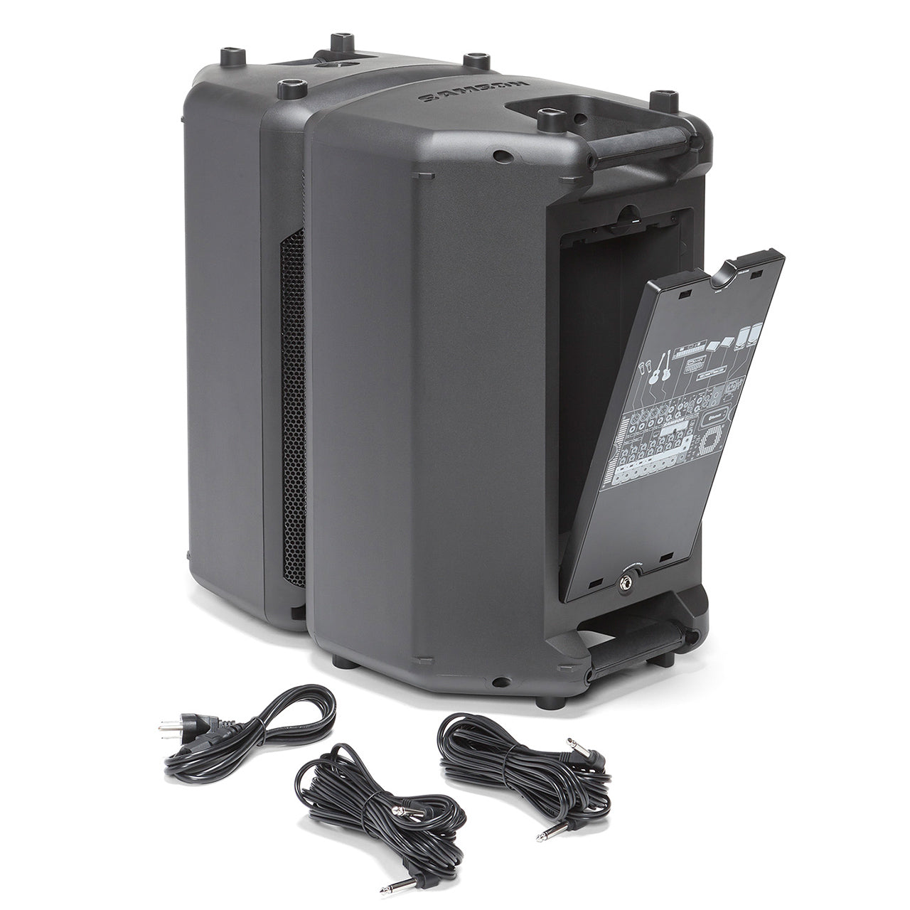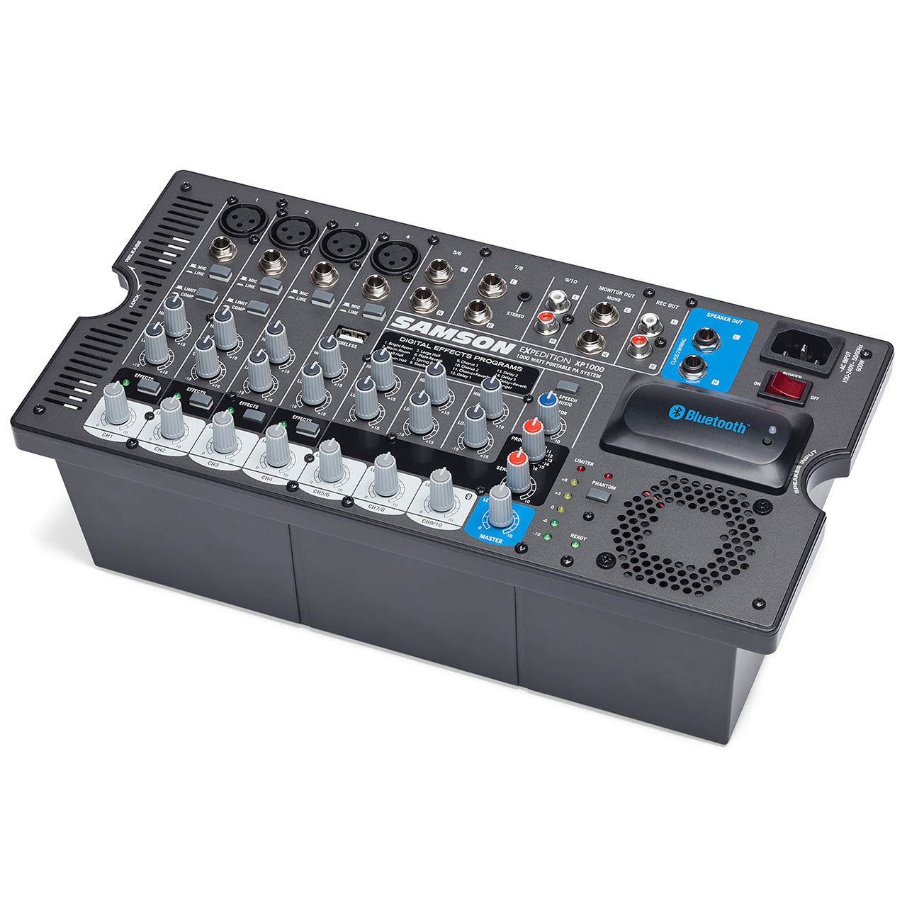 The Expedition XP1000 1,000W Portable PA System from Samson consists of dual speakers and a removable 10-channel mixer and can be used for live music performance, DJ sets, parties, and office or academic applications. It is capable of up to 1,000 watts of combined output and is powered by a Class D amplifier. The XP1000 has a variety of input options, including Bluetooth streaming audio, 4 XLR and 1/4" mic/line inputs, and stereo 1/4", 1/8", and RCA auxiliary inputs.