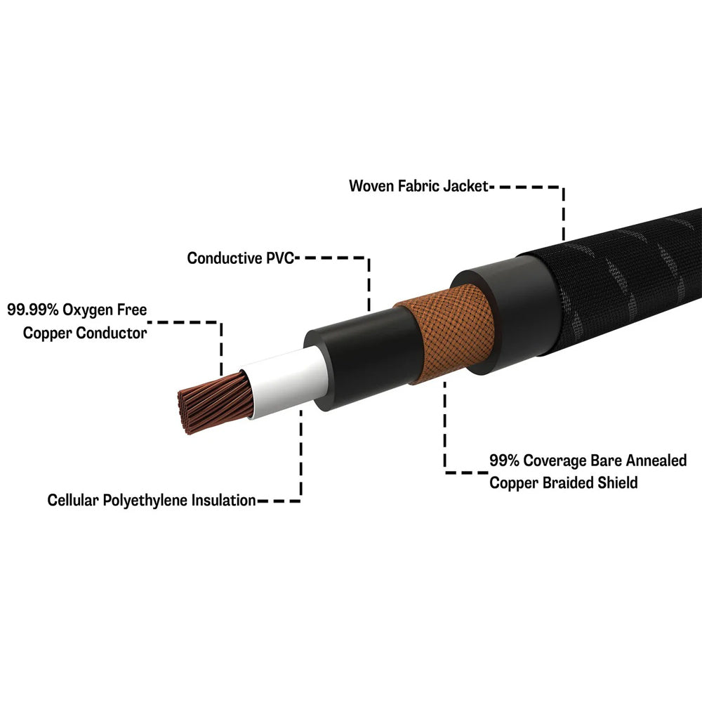 - 99% braided shield and carbon-impregnated conductive PVC insulation for low noise and excellent rejection of RF/EMI interference.