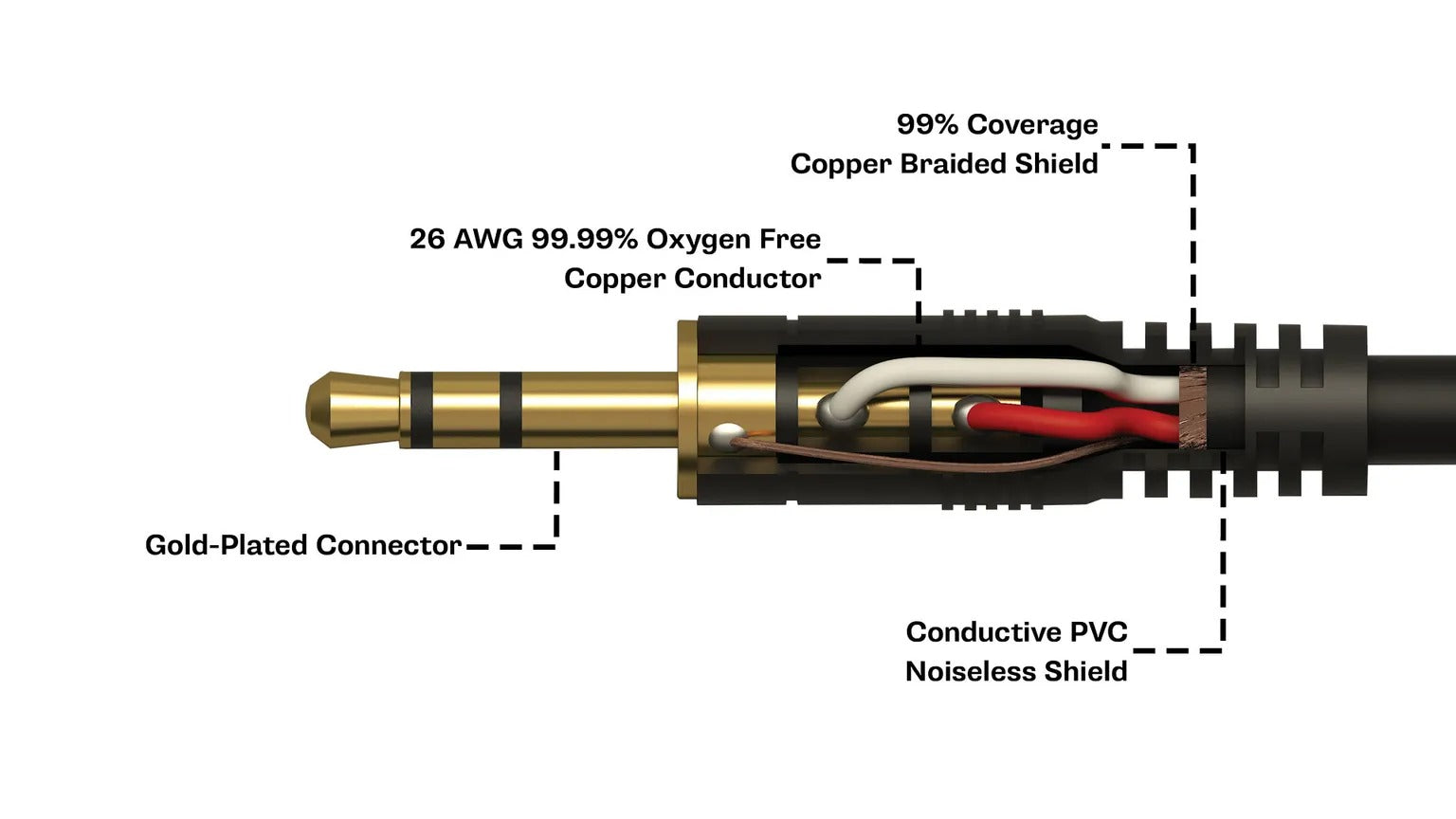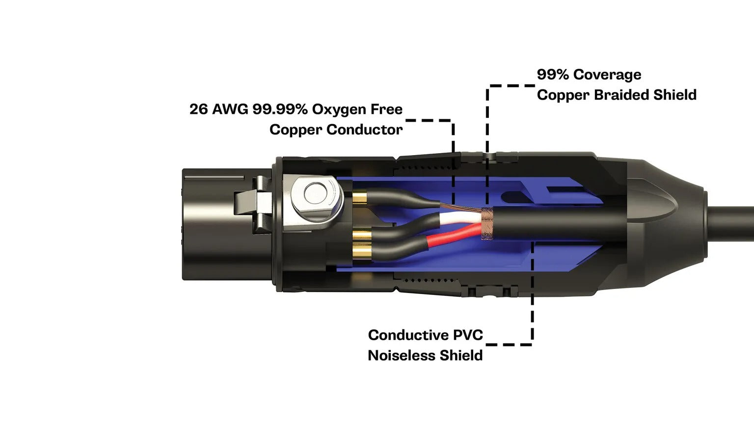 99% braided shield and carbon-filled conductive PVC insulation for low noise and excellent rejection of RF/EMI interference.