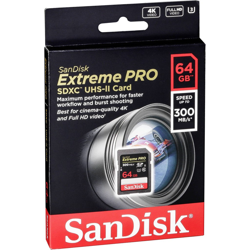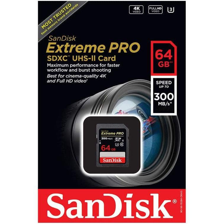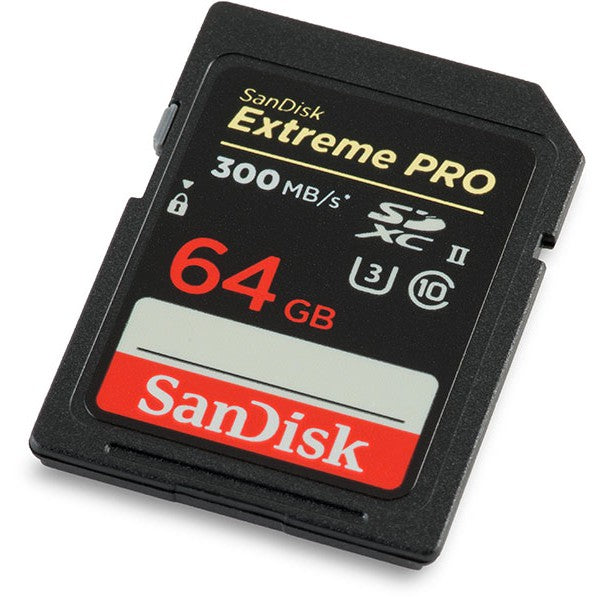 Fast SDXC Memory Card This 64GB Extreme PRO UHS-II SDXC memory card supports enhanced data read speeds of up to 300 MB/s to help you maximize post-production workflow efficiency. You also benefit from improved data write speeds of up to 260 MB/s, supporting advanced camera functions such as continuous burst, rapid shooting, and RAW plus JPEG capture.UHS Speed Class 3 Rated for 4K and Full HD Video Capture With a UHS Speed Class 3 rating (faster than UHS Speed Class 1 and Class 10), this 64GB Extreme PRO UHS-II SDXC memory card gives you the power to capture uninterrupted, cinema-quality 4K, 3D, and Full HD video at a minimum sustained write speed of 30 MB/s.