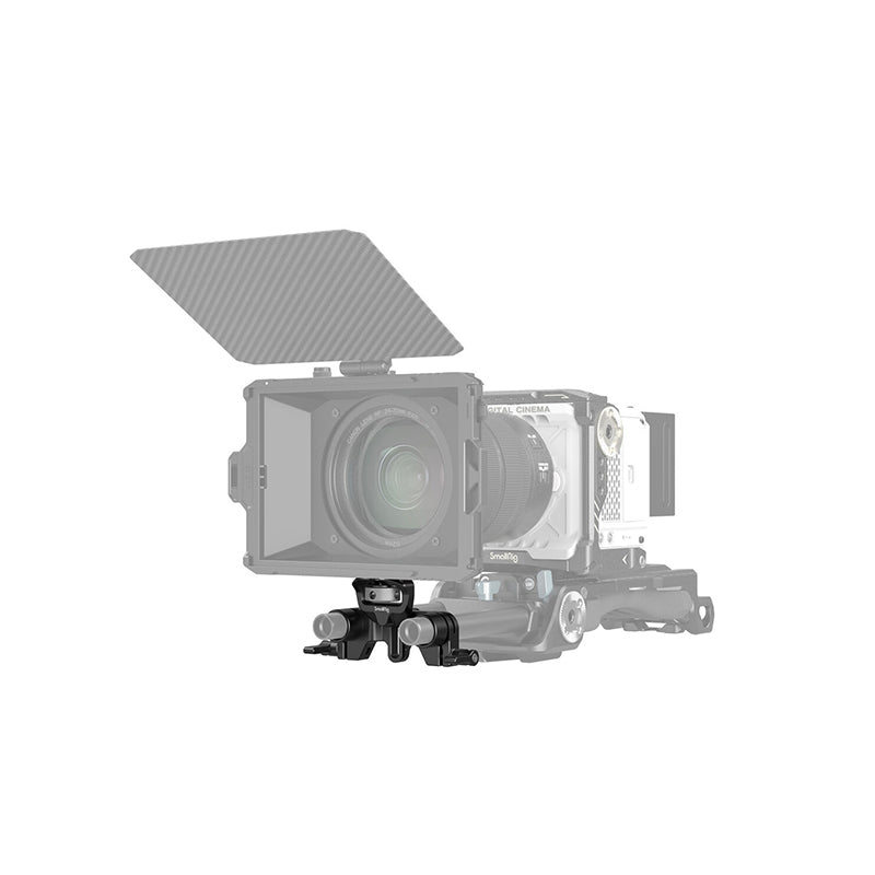 Attach a SmallRig Star-Trail, Revo-Arcane, or Mini Series matte box to a rail support system using the SmallRig 15mm LWS Support. A 1/4"-20 anti-twist screw secures the matte box, and dual 15mm LWS rod clamps secure the support to a compatible rail system. The support is vertically adjustable 0.8" and accommodates a wide range of DSLR and cine lenses. A horizontal support at the bottom prevents tilting for an additional layer of security.