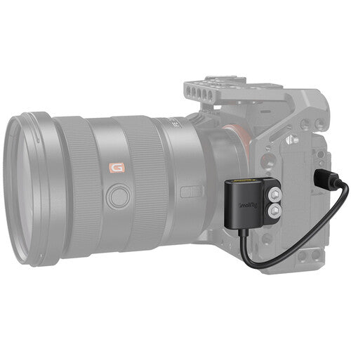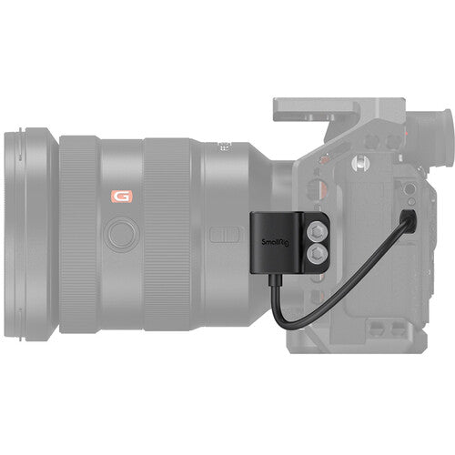 The female end of the adapter cable features two 1/4"-20 threads to attach to a cage, bracket, or rig, and the threads measure 0.35" apart from center-to-center. Two screws are included to mount the adapter onto your rig. This flexible, ultra-slim PVC cable measures only 0.1" in diameter and measures 5.6" in length. Read more below about compatibility options.