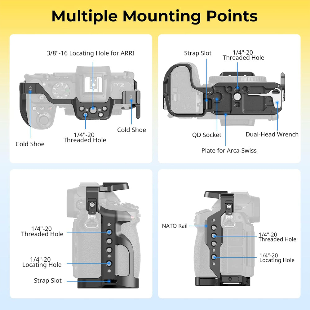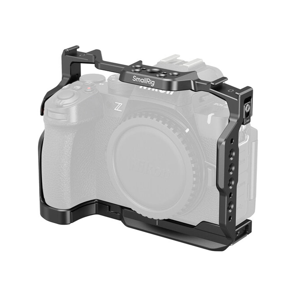 This lightweight aluminum Camera Cage from SmallRig protects and provides accessory mounting for your Nikon Z50 II camera. This formfitting cage maintains access to all the camera's controls, battery, and SD card slots, and it features a variety of mounting options. The camera secures onto the cage using three screws to prevent twisting. A screen protector is included for your rear display.