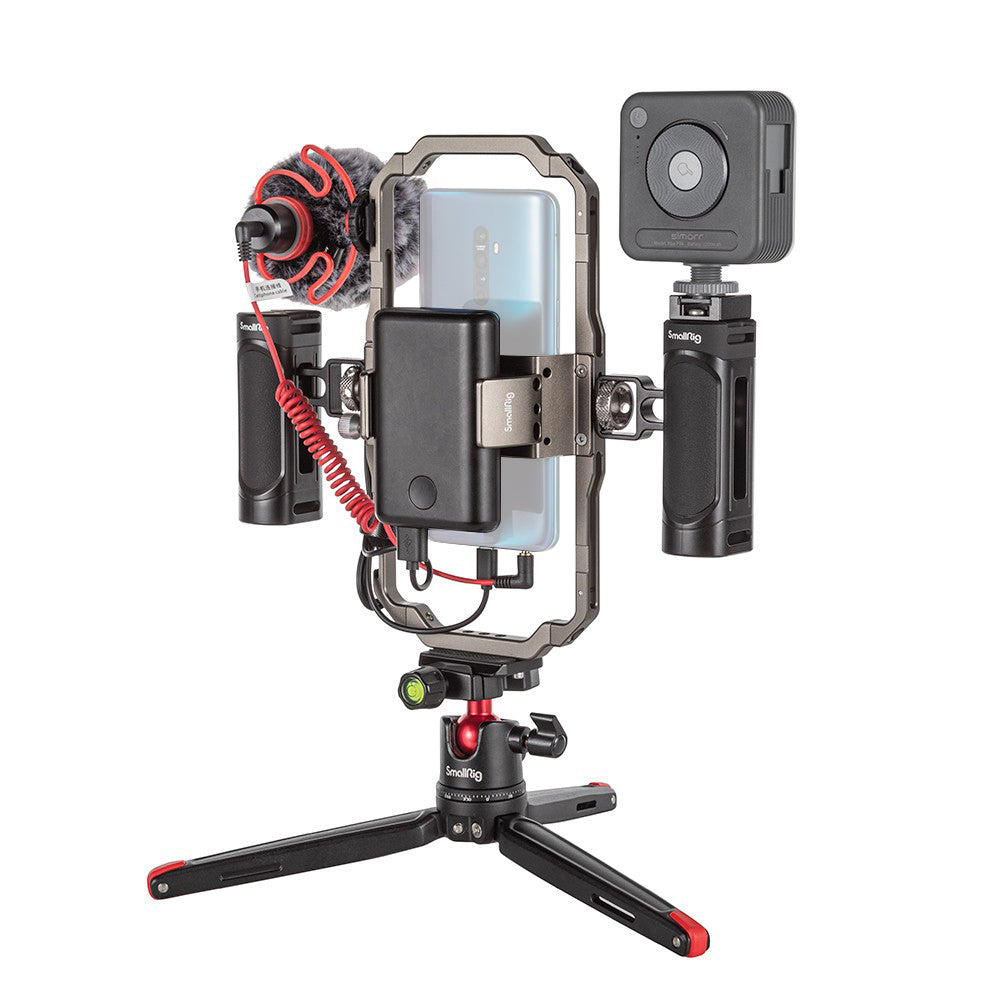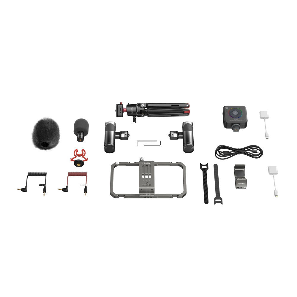 SmallRig All-in-One Video Kit Classic 3384B, Set your smartphone up for high-quality vlogs or live streams. The full-featured kit includes a smartphone cage, a desktop tripod, a power bank holder, two side handles, a shoe mount, an LED light, a microphone, a microphone shock mount, furry and foam microphone windshields, a camera cable, a smartphone cable, a charging cable, a case, and assembly hardware.