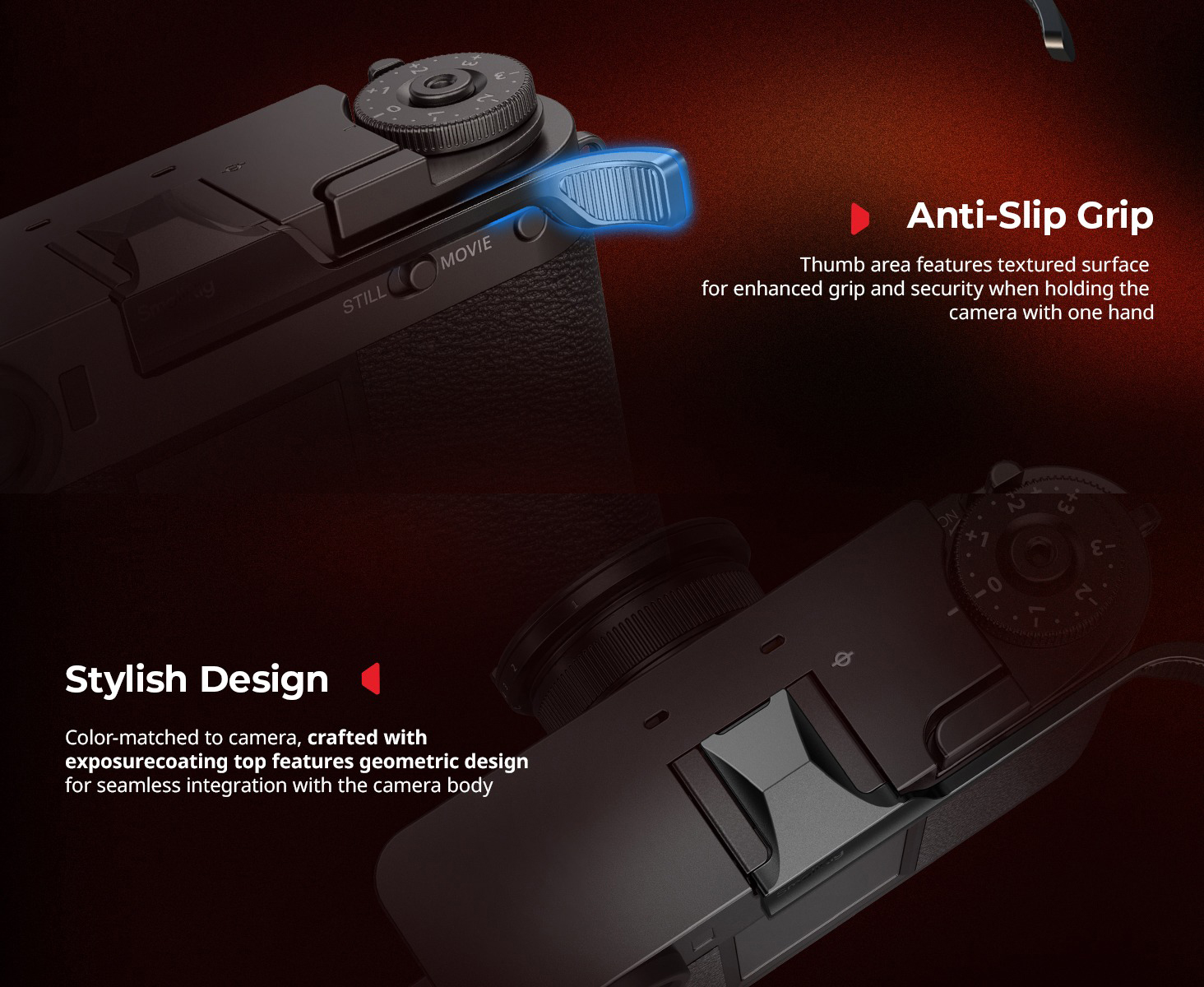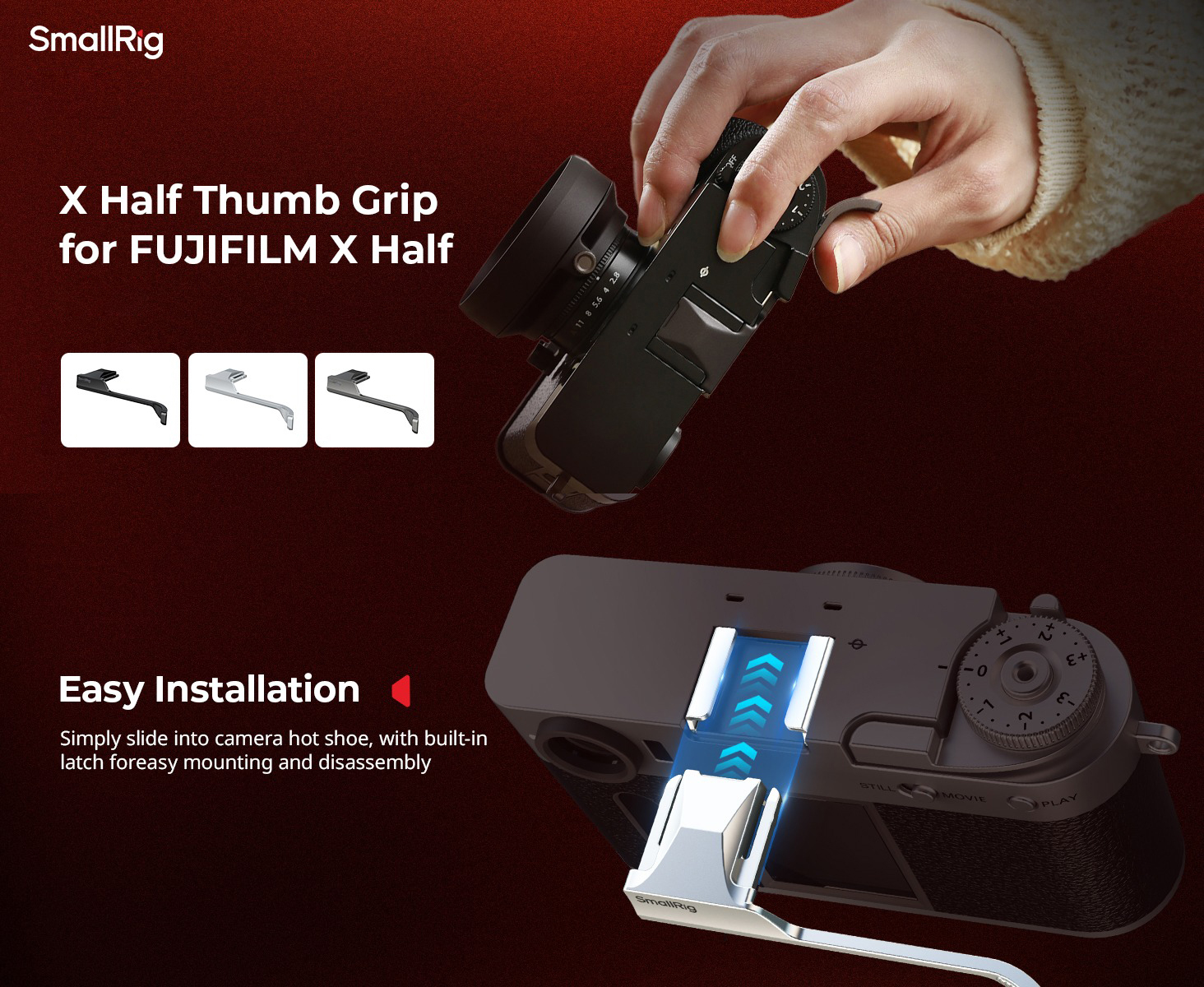 This Thumb Grip for FUJIFILM X half from SmallRig is an ergonomic thumb rest with an anti-slip texture for added grip and comfort. This accessory is color-matched to seamlessly blend in with the camera body. It features a detach slot for instant removal and integrated silicone pads to protect the camera body and hot shoe connection. Use this accessory to distribute weight and enhance grip when holding the FUJIFILM X half with one hand.