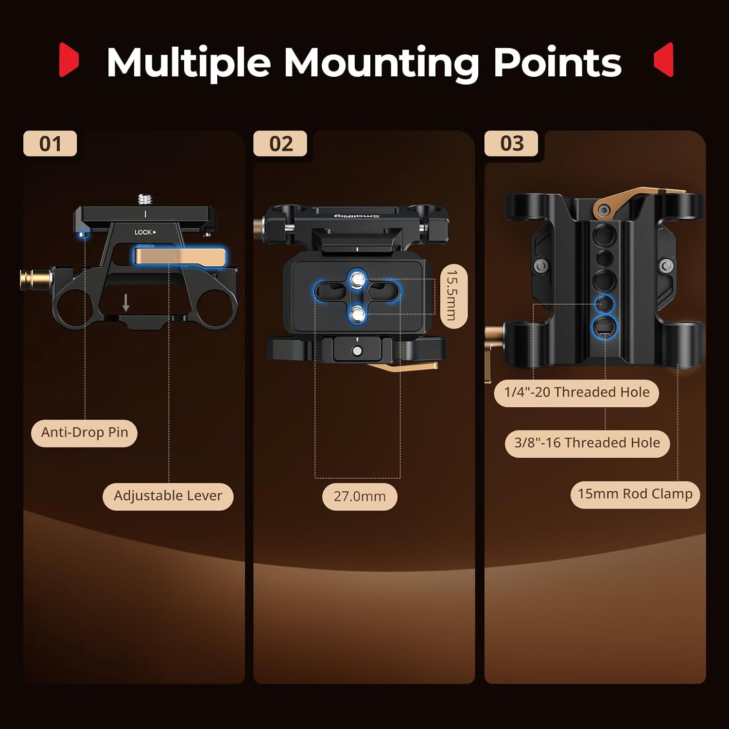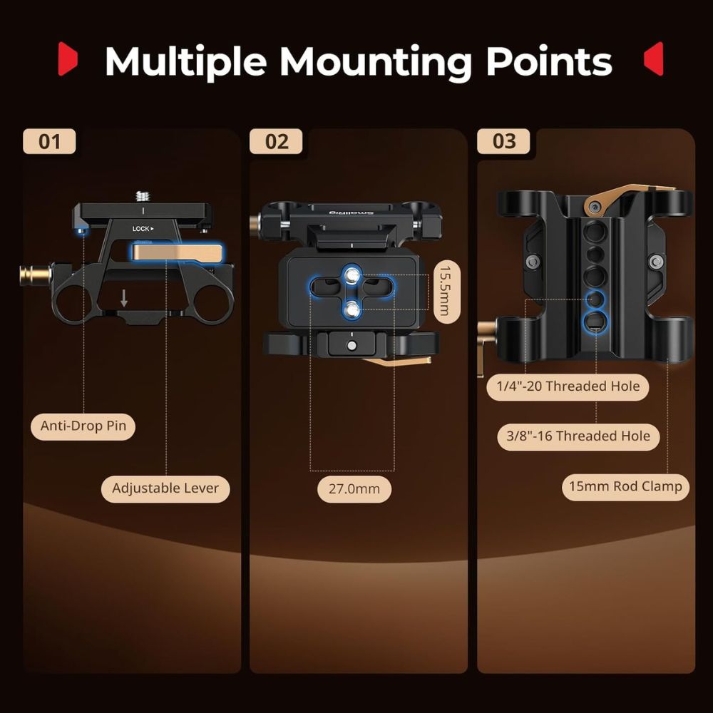 • Dual-Rod Expansion Capability: The SmallRig Mount Plate Kit 5365 is designed to facilitate users to expand accessories with 15mm rod clamps. The mounting base can quickly lock the 15mm rods through a one-lock-two design, allowing for the attachment of lens supports, follow focuses, matte boxes, V-mount battery plates, and other accessories.