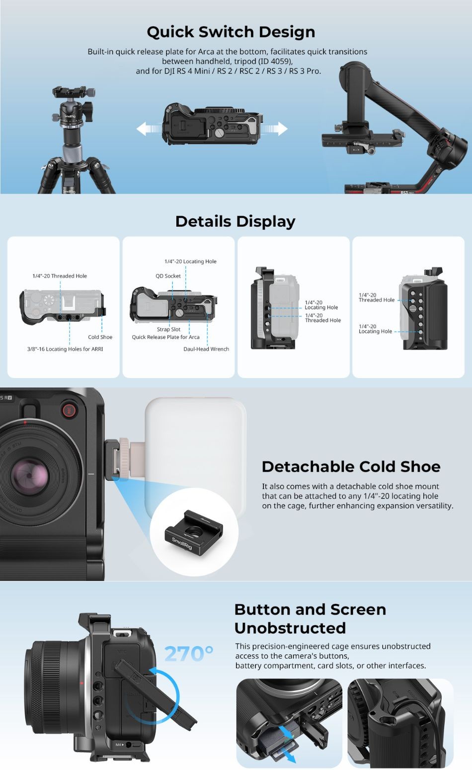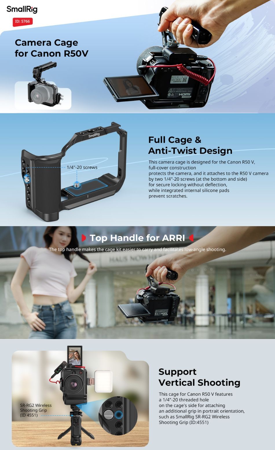 - Integrated Full Cage: Dedicated for EOS R50 V to provide both rugged protection and versatile expansion;
