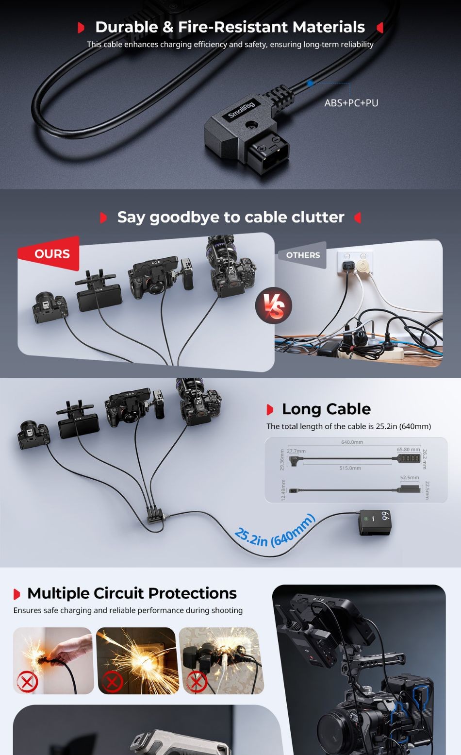 • Durable & Fire-Resistant Materials: This smallrig d-tap splitter cable is made of fire-resistant ABS, PC, and PU materials, which not only enhance charging efficiency but also have excellent high-temperature resistance and wear resistance.The solid material selection ensures the long-term reliability of the cable