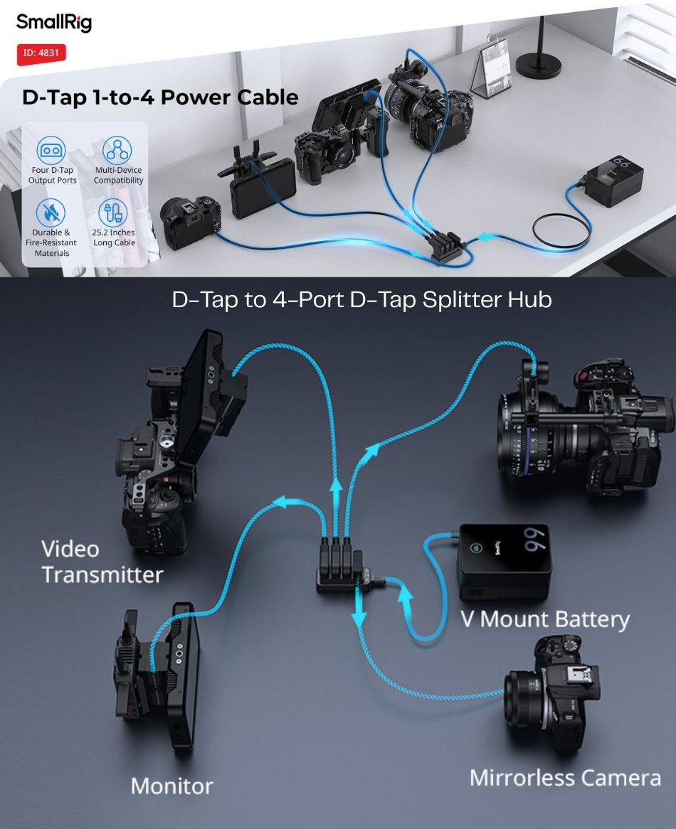 • Efficient 1-to-4 D-Tap Splitter: The SmallRig DT1-4 Power Cable 4831, a professional d tap splitter, converts one single D-Tap input into four independent D-Tap outputs, enabling simultaneous power delivery to four devices. Whether you need to power mirrorless cameras, monitors, video transmitters, or follow focus systems during shooting, this d-tap splitter cable can meet your needs, eliminating the trouble of tangled cables and making device connections more concise
