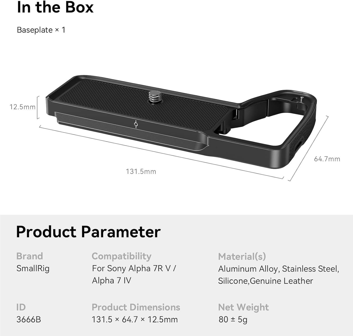SmallRig Baseplate for Sony Alpha 7R V / Alpha 7 IV 3666B aims to improve grip experience and enable tripod and handheld shooting while protecting the bottom of the camera. It attaches to the bottom of the camera via a 1/4" -20 screw and locating pin, with features built-in silicone pad to prevent scratches and twisting. There is a spindle spanner at the battery door which fits camera curve and leave room for little finger for comfortable grip; embedded select genuine leather in the baseplate integrates into camera body. 1/4"-20 threaded holes and cold shoes at the bottom support mini tripods and microphones. Besides, the Arca compatible baseplate allows quick switching between tripod, stabilizer (DJI RS 2 / RSC 2 / RS 3 / RS 3 Pro) and handheld shooting. Accessible built-in magnetic spanner facilitates disassembly and assembly.