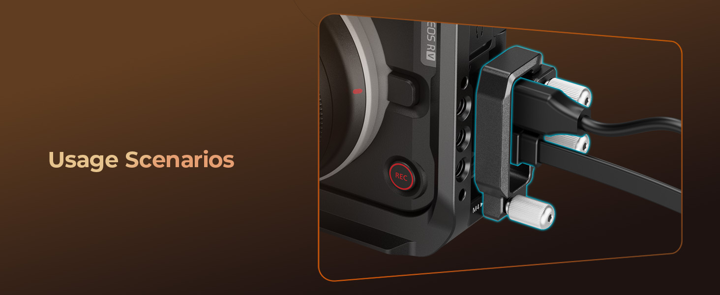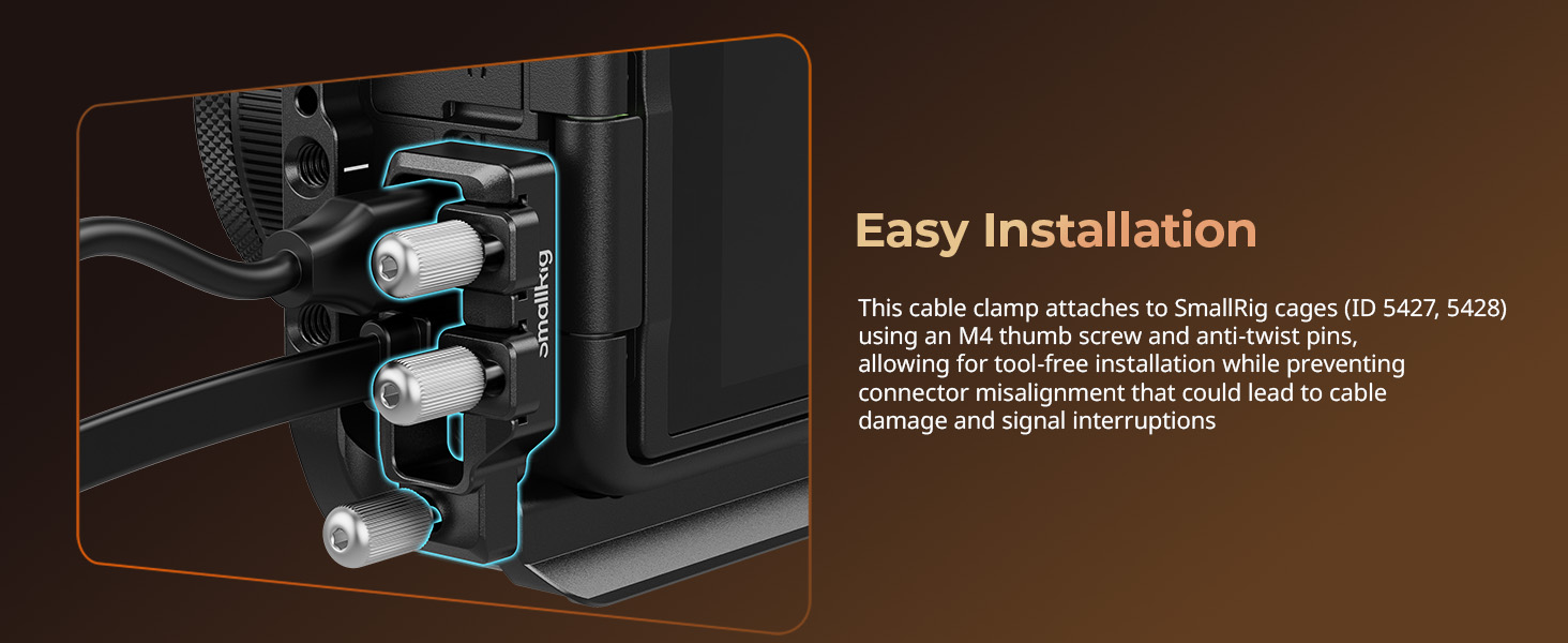 • Easy Installation: This cable clamp attaches to SmallRig cages (ID 5427, 5428) using an M4 thumb screw and anti-twist pins, allowing for tool-free installation while preventing connector misalignment that could lead to cable damage and signal interruptions.