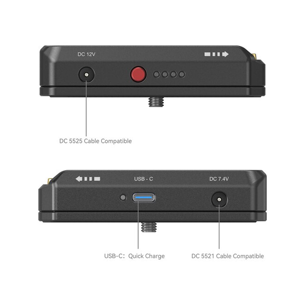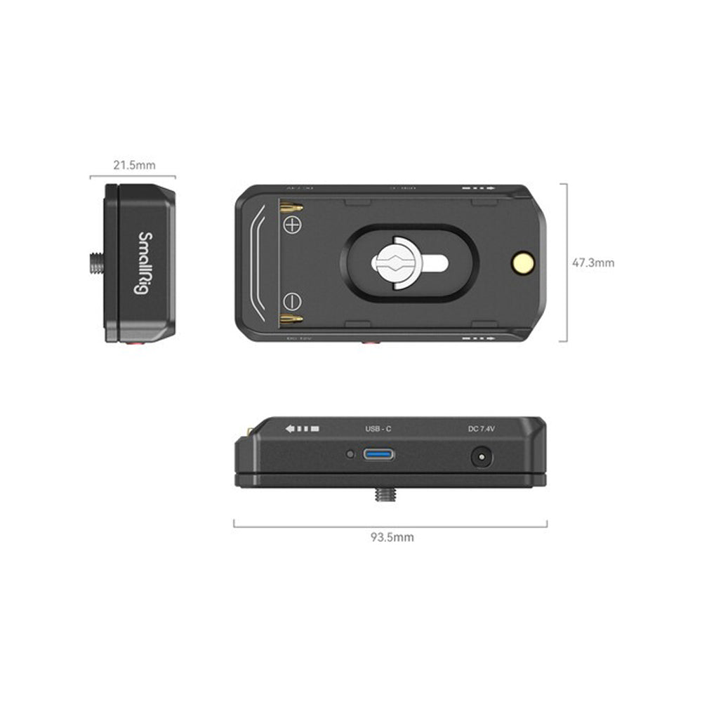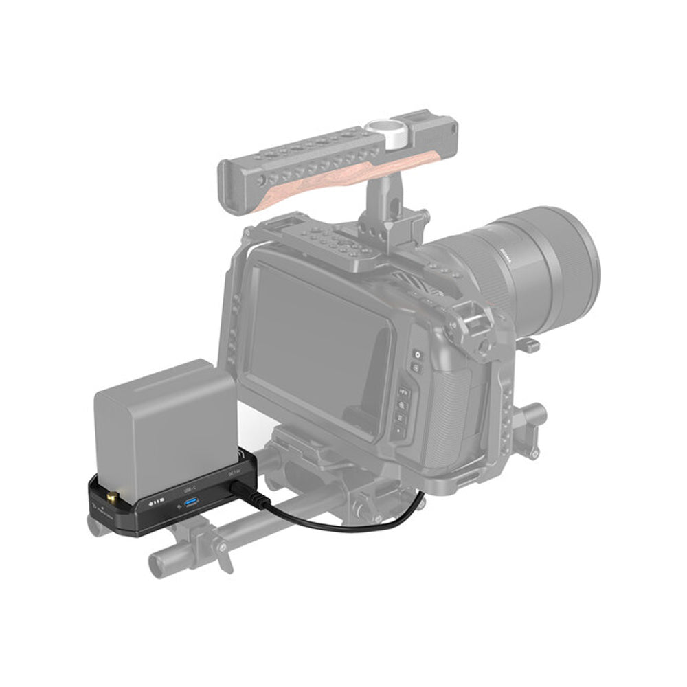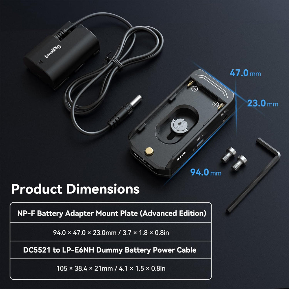 SmallRig NP-F Battery Adapter Mount Plate Kit for Canon EOS R5 / R5C and BMPCC 4K / 6K (Advanced Edition) 4340 is designed to enable NP-F batteries on the market (including Sony original and third-party batteries) to power BMPCC 4K/6K, Canon R5 C, and various mirrorless cameras, the set can achieve long-lasting power supply. The NP-F Battery Plate is made of aluminum alloy with gold-plated electrical contacts to be more durable and conductive. The plate has a self-locking button for quick and secure battery installation and a 1/4''-20 threaded hole for easy attachment to the cage. There are 36W 7.4V / 12V DC output on its sides and a 36W USB-C port, which can output current or charge an NP-F battery. All ports have short circuit protection and automatic wake-up and sleep functions. In addition, this item features LED lights indicating USB charging and discharging state, battery connection, and battery life.