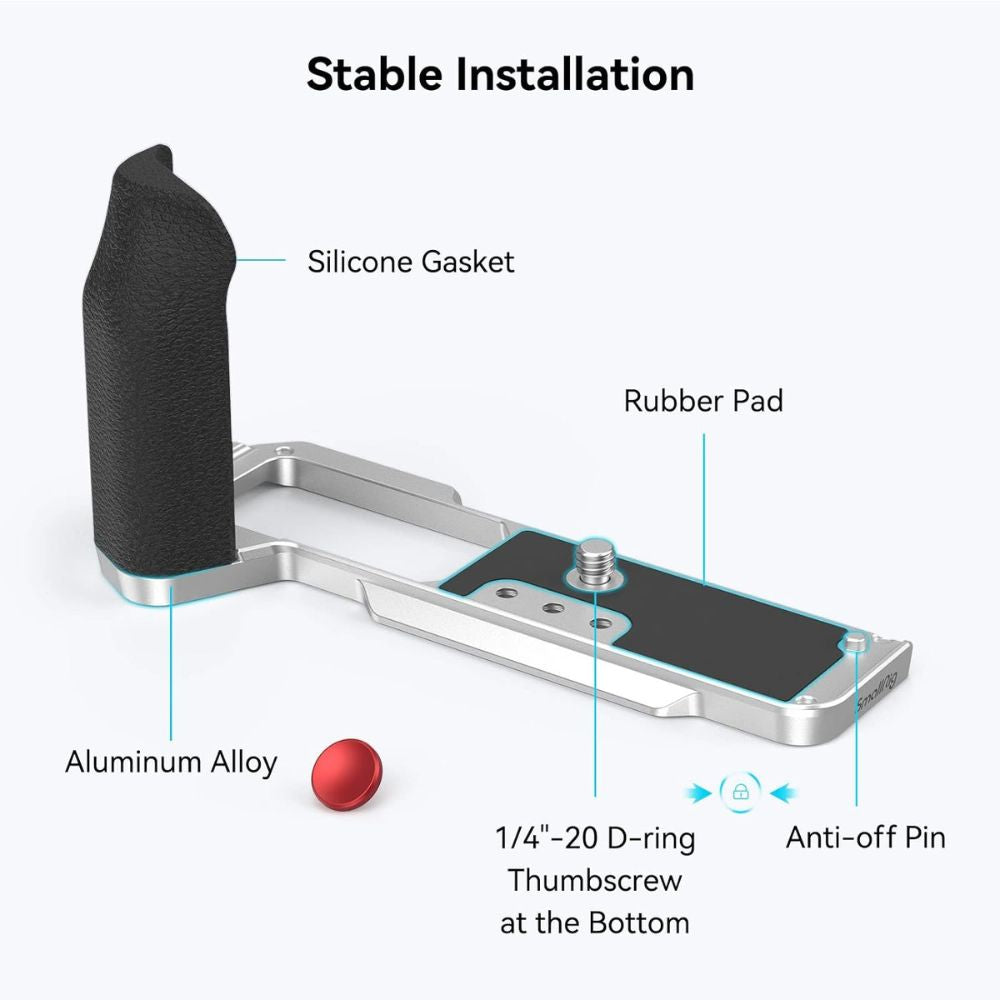 The L-shape Grip is custom-designed for the Fujifilm X-T5, offering a comfortable, ergonomic handgrip made of silicone for a non-slip experience. It features a baseplate that matches the camera's silver surface and locks the camera in place with a 1/4"-20 D-ring thumbscrew.