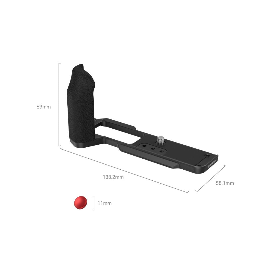 The grip integrates a built-in Arca-type quick-release plate for easy tripod mounting and weighs just 79g, making it lightweight and compact. It also includes a shutter button for improved usability and has a strap slot for a SmallRig hand strap and 1/4"-20 mounting holes for a mini tripod.