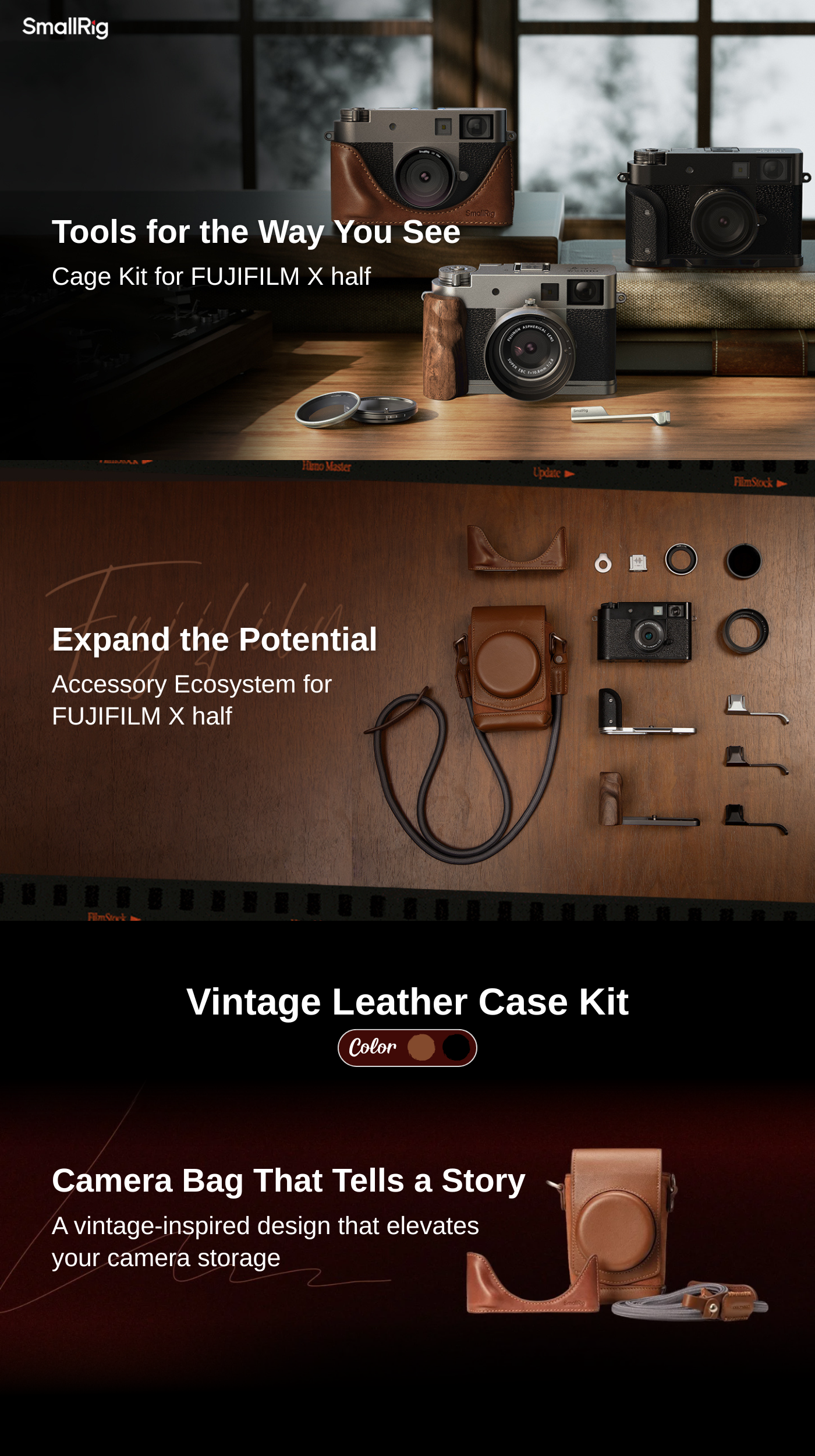 Elevate your camera’s style and protection with the SMALLRIG Leather Case Kit — a high-quality, vintage-inspired accessory set designed for the FUJIFILM X-Half body. The kit combines genuine leather craftsmanship with practical photography ergonomics: a custom half-case with integrated grip for enhanced handling, plus a full-coverage carrying bag with suede lining and built-in card slots. Supplied braided shoulder strap and sturdy metal loops make it easy to carry, while the premium materials deliver both protection and retro aesthetics. Whether you’re shooting on the go or storing the camera between sessions, this kit gives you style, comfort and convenience.