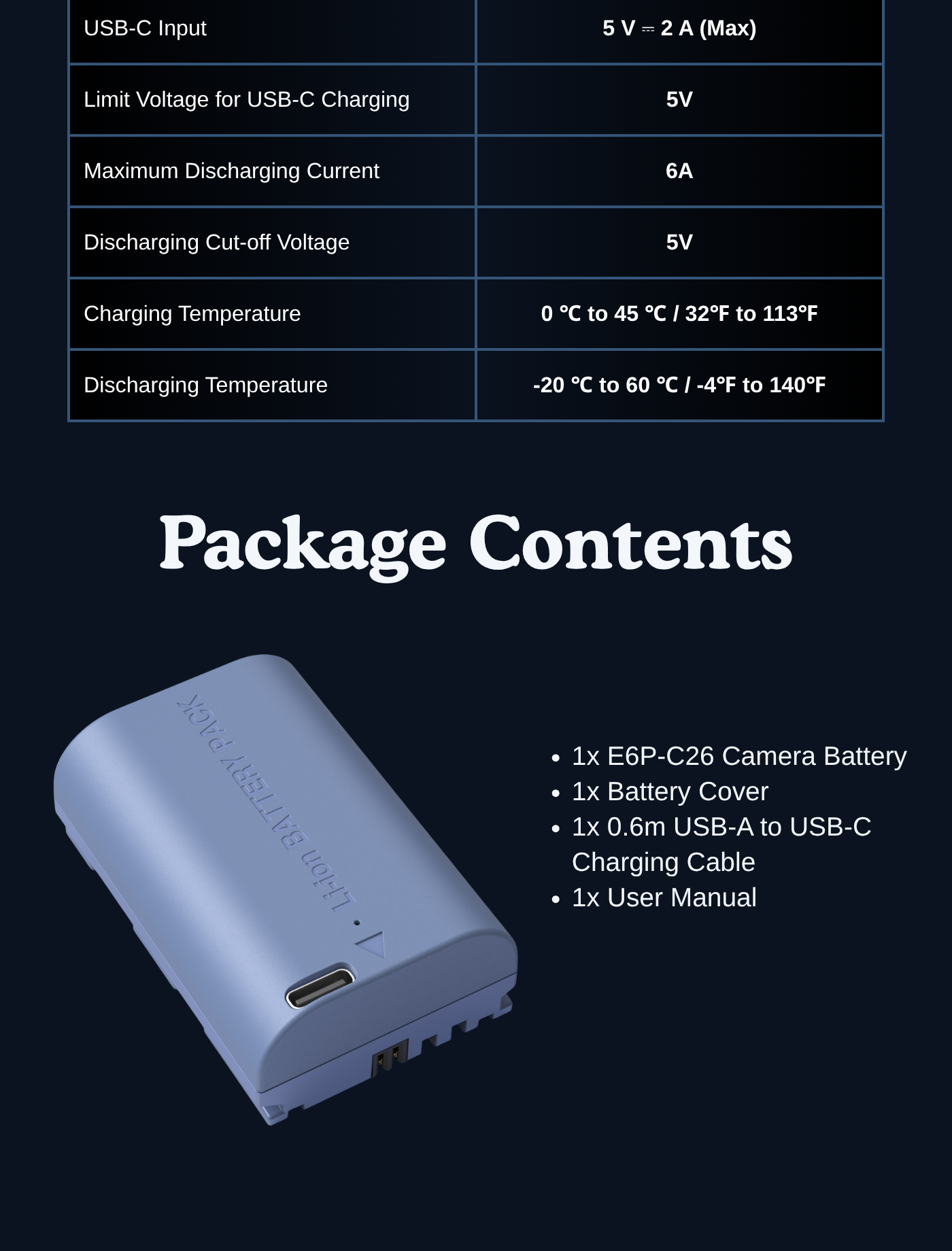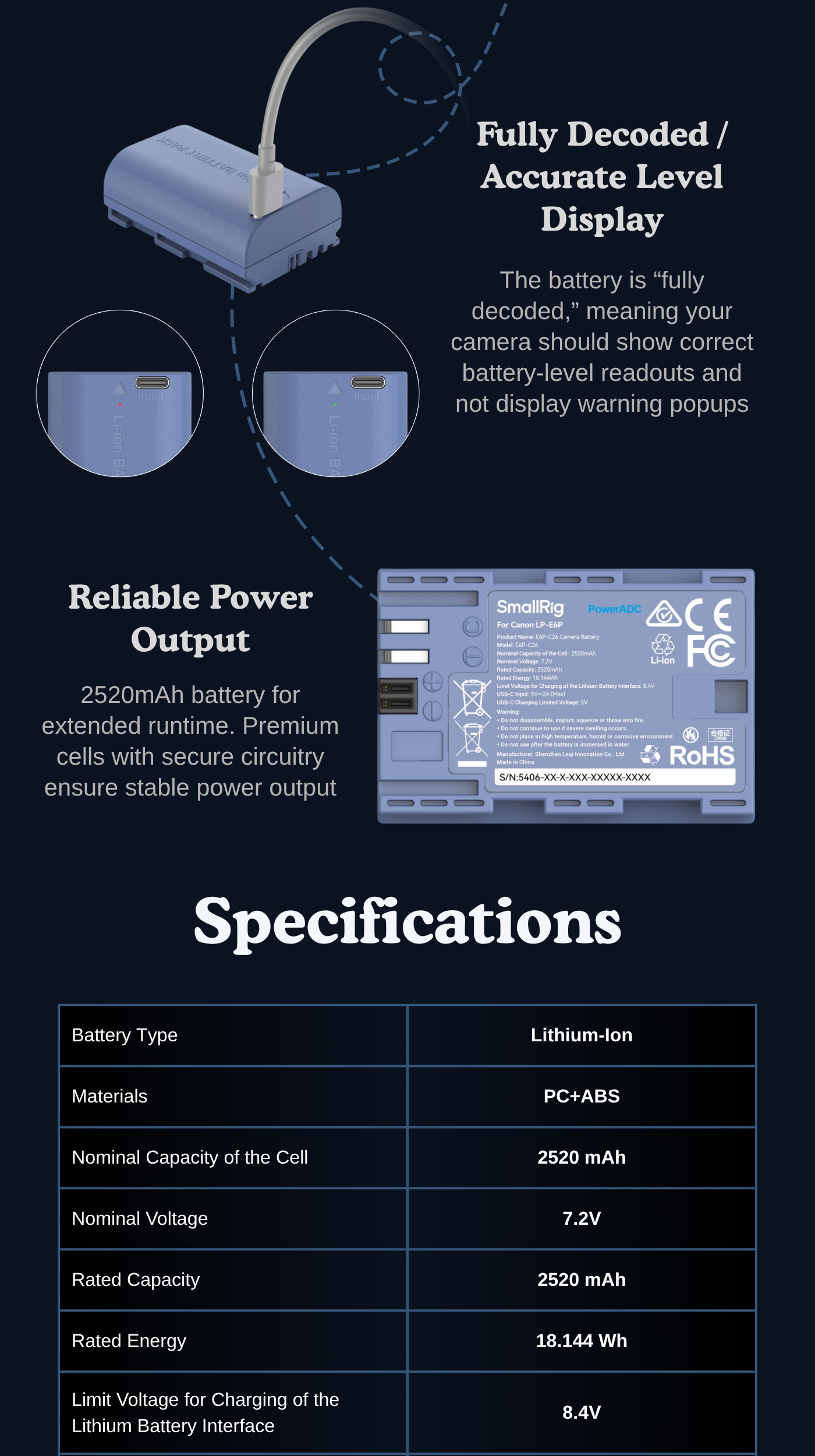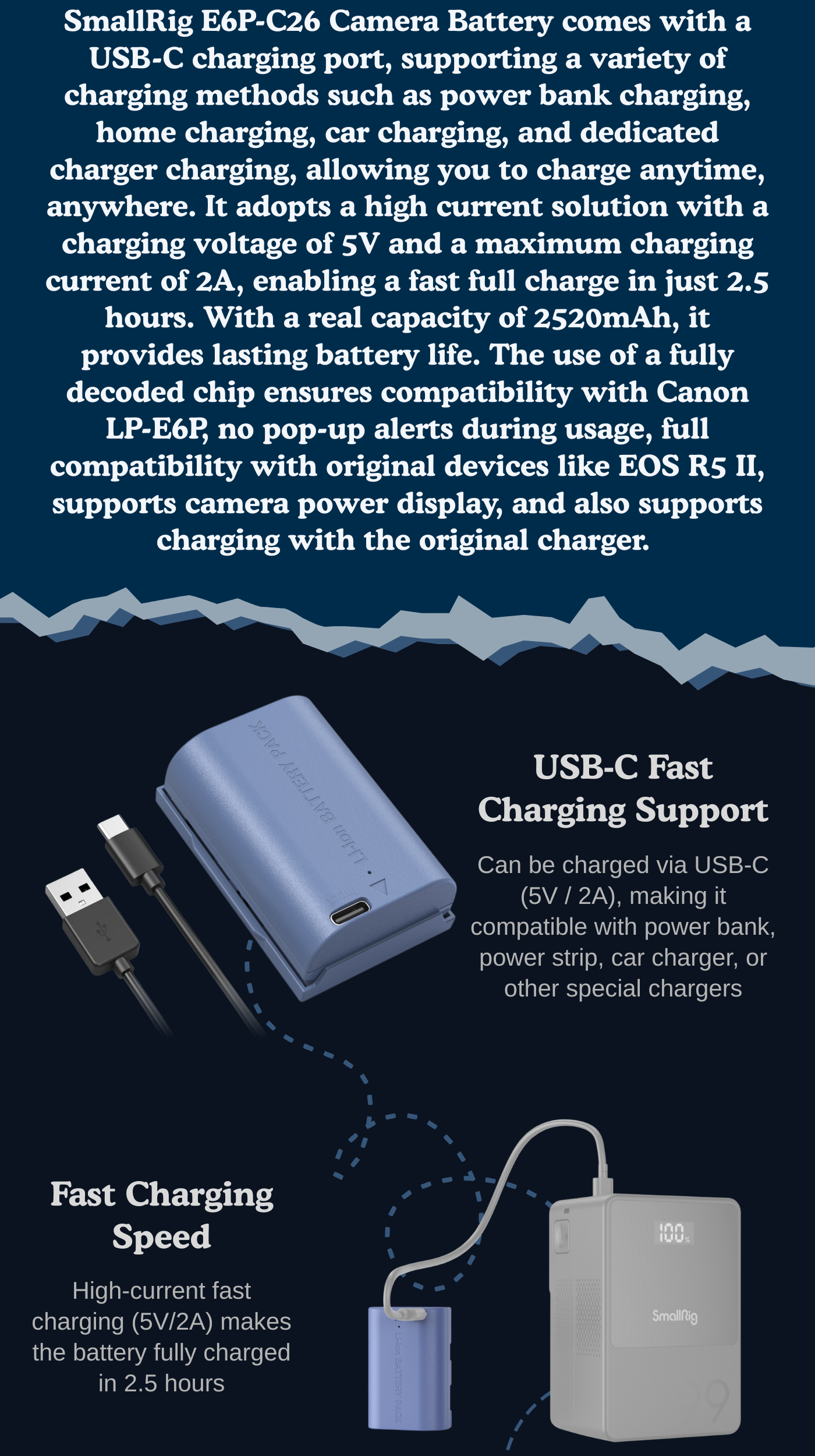 SmallRig E6P-C26 Camera Battery comes with a USB-C charging port, supporting a variety of charging methods such as power bank charging, home charging, car charging, and dedicated charger charging, allowing you to charge anytime, anywhere. It adopts a high current solution with a charging voltage of 5V and a maximum charging current of 2A, enabling a fast full charge in just 2.5 hours. With a real capacity of 2520mAh, it provides lasting battery life. The use of a fully decoded chip ensures compatibility with Canon LP-E6P, no pop-up alerts during usage, full compatibility with original devices like EOS R5 II, supports camera power display, and also supports charging with the original charger. The exterior features a unique new color scheme for a distinctive look. The shell is made of high-quality ABS+PC fire-resistant material, which is heat-resistant, safe, reliable, and durable. The size of the battery is the same as the original camera battery, fitting tightly in the camera battery compartment, ensuring no jamming during installation.