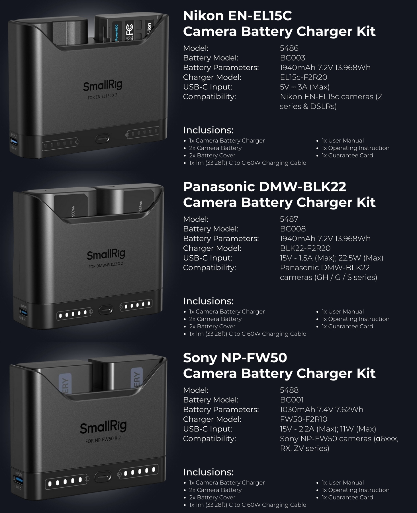 SmallRig NP-FZ100 / LP-E6NH / EN-EL15C / DMW-BLK22 / NP-FW50 Camera Battery Charger Kit