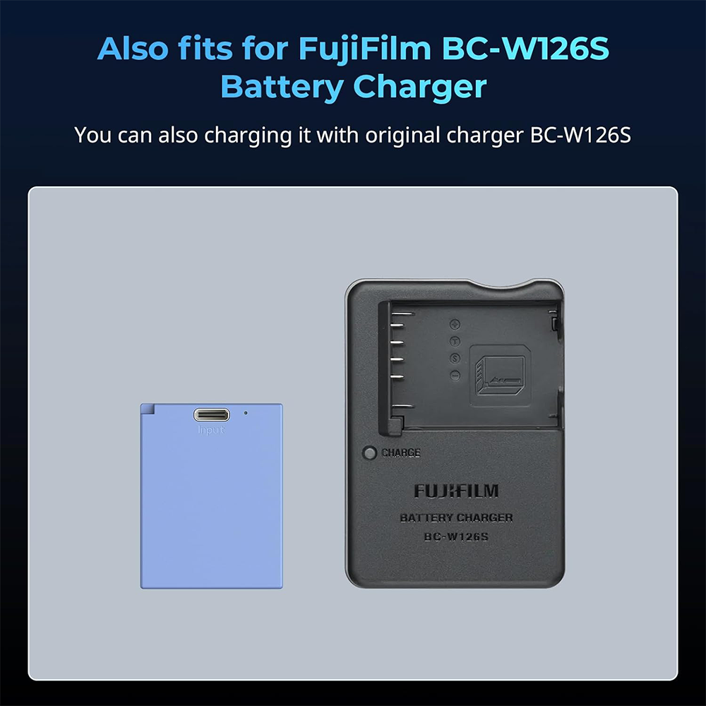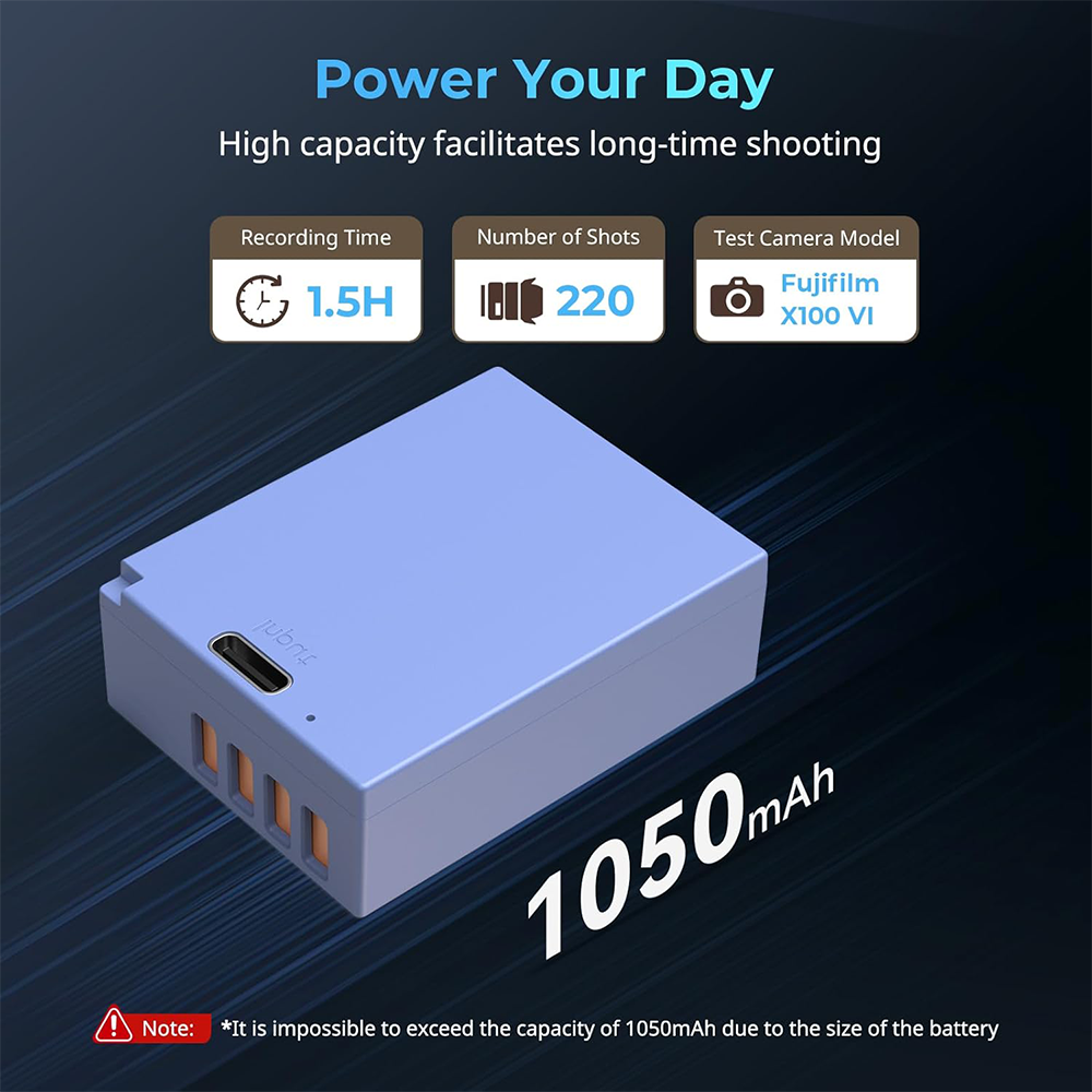 The SmallRig NP-W126S USB-C Rechargeable Camera Battery has the same build as the FUJIFILM NP-W126S and features a USB-C port for fast and convenient charging with a power bank, power strip, car charger, or other compatible chargers. It features a 1050mAh capacity and charges fully in just 2.5 hours, offering extended shooting time. The battery is fully decoded for seamless use without pop-ups and is designed with a durable, fire-resistant, ABS and PC shell.