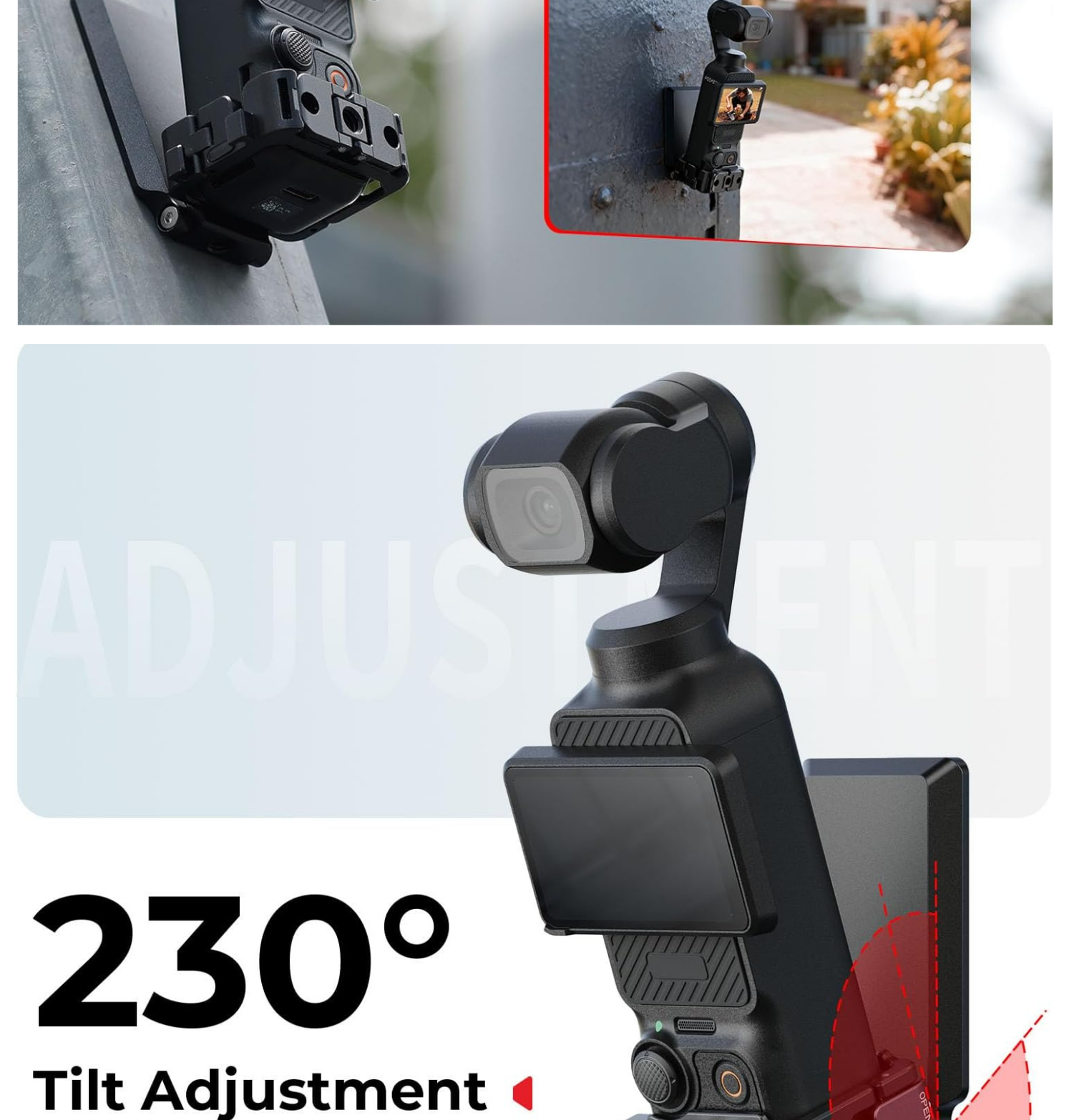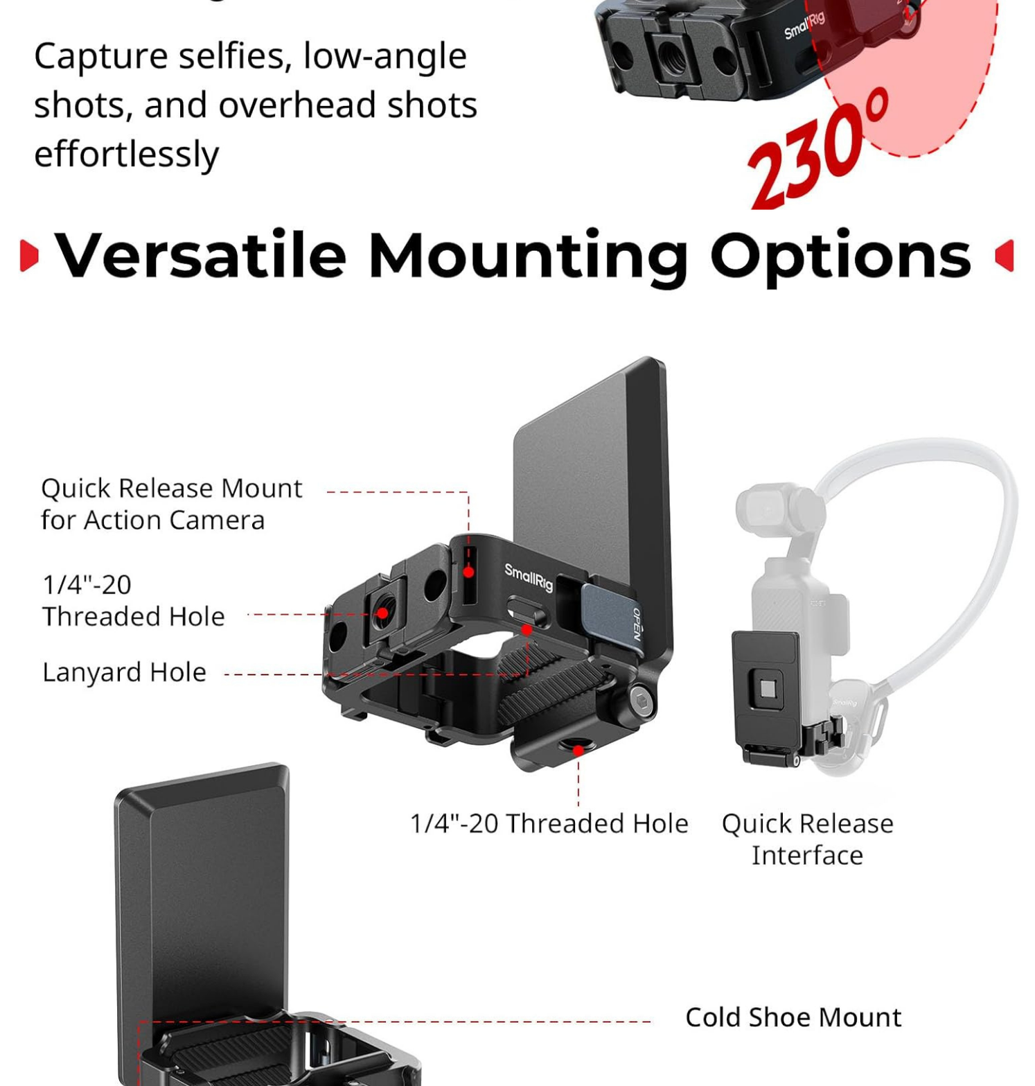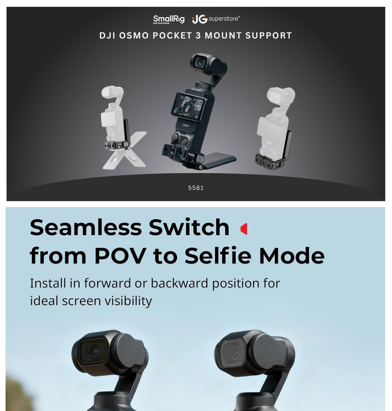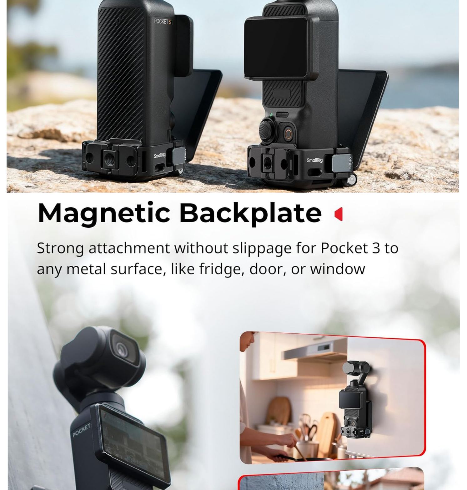 The SmallRig 5581 Magnetic Mount Support enhances your DJI Osmo Pocket 3's versatility. The magnetic Arca-type backplate attaches securely to ferrous metal surfaces, allowing you to film dynamic vlogs and sequences. Its reversible mounting enables flexible screen orientation, and the 230° tilt accommodates selfies, low-angles, and overhead shots.