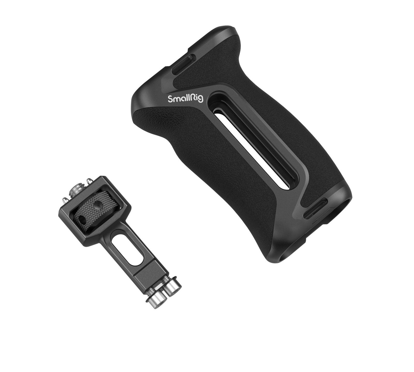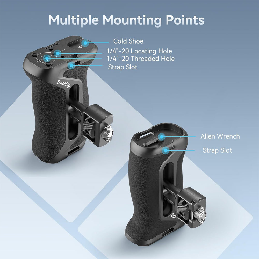 SmallRig Side Handle with Two-in-One Locating Screw 4346 is designed to facilitate camera movement and stabilize dual-handed shooting while providing basic mounting points. The interface has a stretchable design, and high versatility compatible with cages, plates, etc. of coming with 1/4"-20 locating holes and ARRI 3/8"-16 locating holes. Features ergonomic design, which allows to use of the left & right hand interchangeably to provide a comfortable grip. According to the actual camera size, the handle can be adjusted 36mm vertically to ensure the best grip position. Mainly made of high-strength aluminum alloy, and the stretchable mounting points (1/4"-20 locating holes and ARRI 3/8"-16 locating holes) are made of stainless steel material. Features silicon pads on the contact surface with the palm, which are anti-freeze and anti-slip. Comes with 1/4"-20 threaded hole, 1/4"-20 locating hole, strap hole, cold shoe for attaching Monitor Mount 2905, Ballhead Magic Arm 3875, LED Video Light 3286, Microphone 3468, etc. Besides, a built-in magnetic Allen Wrench is included for easy mounting and adjusting accessories.