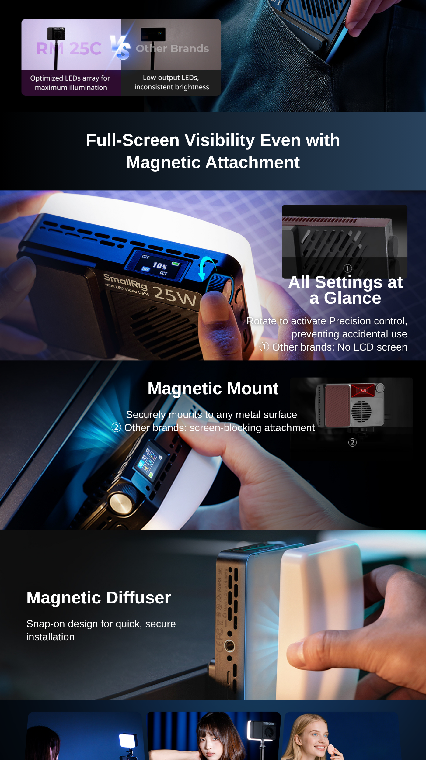 An integrated LCD screen helps monitor your brightness, color temperature, and battery life. The light has a magnetic mounting design to attach to metal surfaces. It also features a 1/4"-20 thread at the bottom for attachment to an articulating arm. The built-in 3100mAh battery keeps the light running at 100% brightness for 50 minutes. A USB-C PD input recharges said battery over 80% in just 45 minutes. An included diffuser helps achieve a softer lighting look.