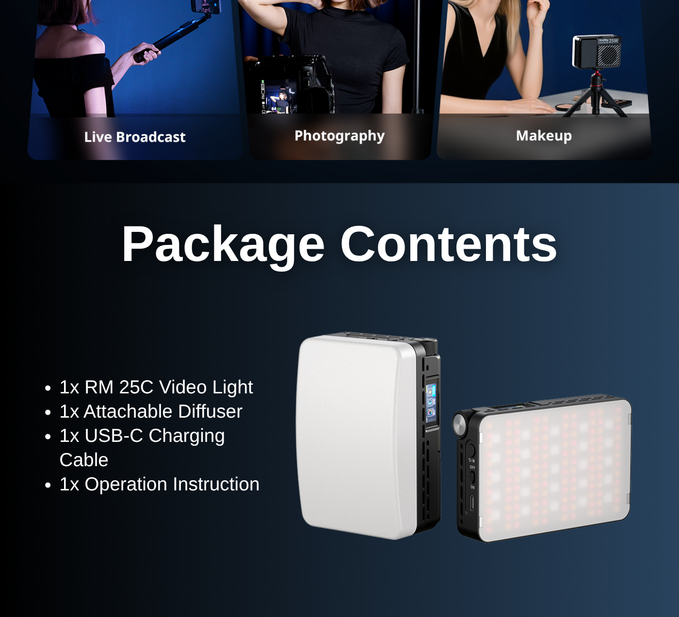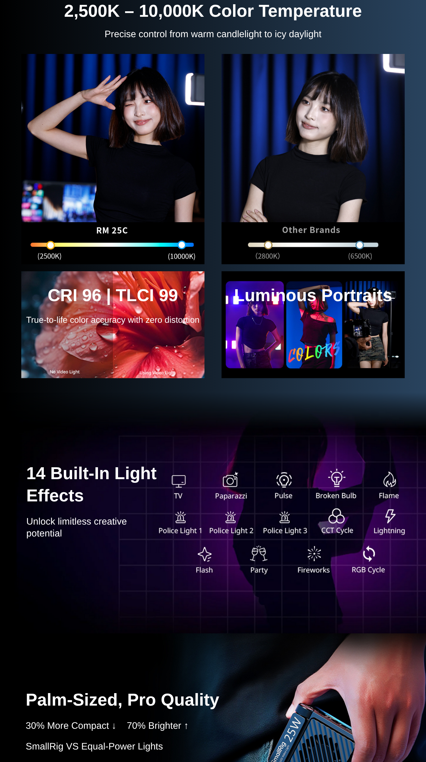The RM 25C Mini LED Video Light from SmallRig is a high-powered, 25W, ultracompact light capable of adding full RGB color to your productions. The light is pocket-sized and features a 2500 to 10,000K color temperature range and 14 built-in lighting effects to execute your creative vision. A CRI of 96 and a TLCI of 99 ensure accurate color reproduction of your subject matter.