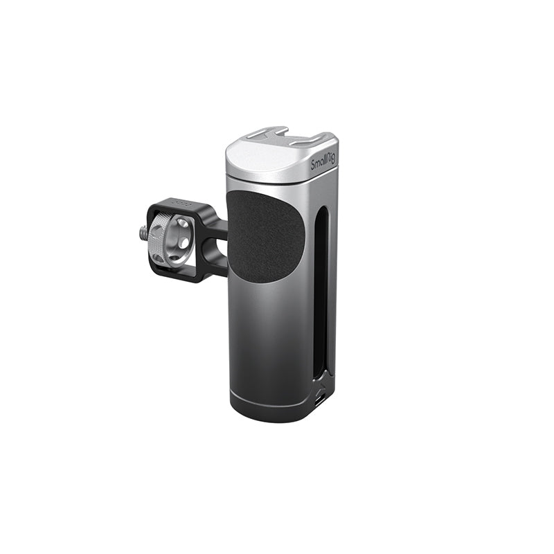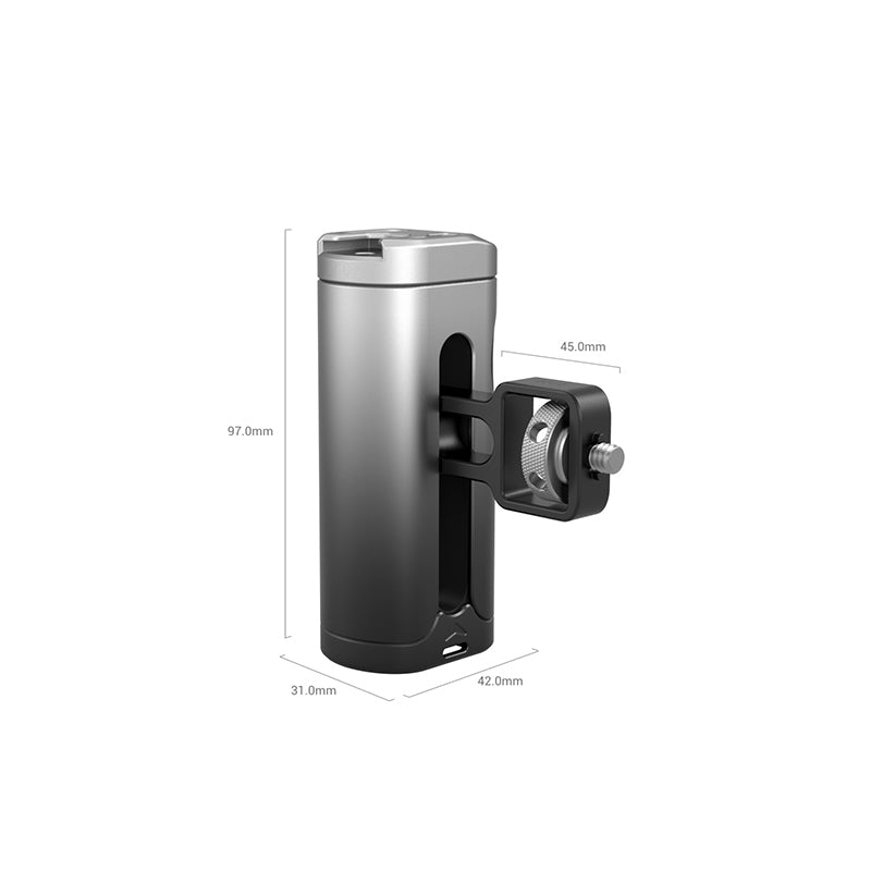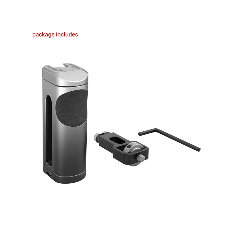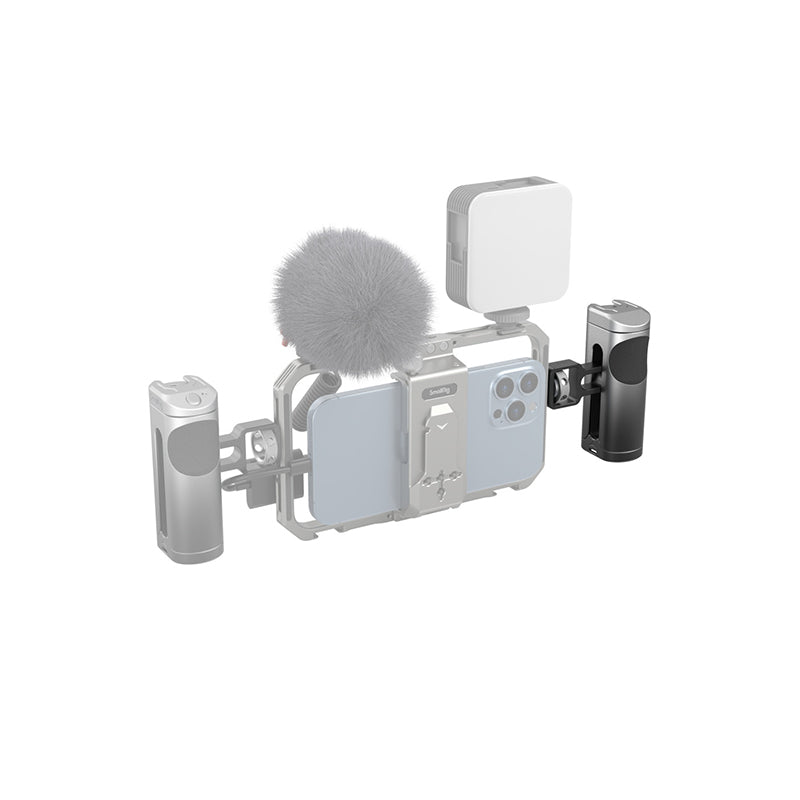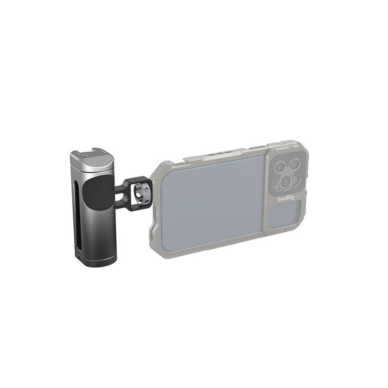 SmallRig Side Handle for Cellphone 3894, features a cold shoe mount on the top of the handle for attaching microphone or LED light for more professional shooting. The handle can be used on the left or right hand by adjusting the handle connector also can be moved up and down according to the center of gravity and position of accessories for a better grip experience. The surface of the handle is made of aluminum alloy with gradient anodizing, which makes it durable and visually impressive. Also, it comes with hole at the bottom for attaching hand strap to prevent accidental falling during shooting.