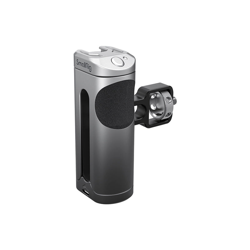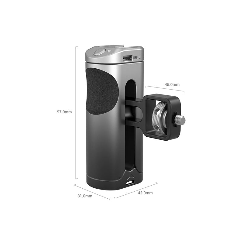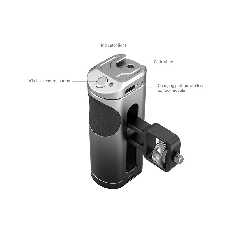 SmallRig Side Handle with Wireless Control for Cellphone 3838, comes with a built-in rechargeable wireless remote control module, supports to control the camera of most Android and Apple smartphones to start or stop the recording, thus improving shooting efficiency and experience. Features a cold shoe mount on the top of the handle for attaching microphone or LED light for more professional shooting. The handle can be used on the left or right hand by adjusting the handle connector also can be moved up and down according to the center of gravity and position of accessories for a better grip experience. The surface of the handle is made of aluminum alloy with gradient anodizing, which makes it durable and visually impressive. Also, it comes with hole at the bottom for attaching hand strap to prevent accidental falling during shooting.