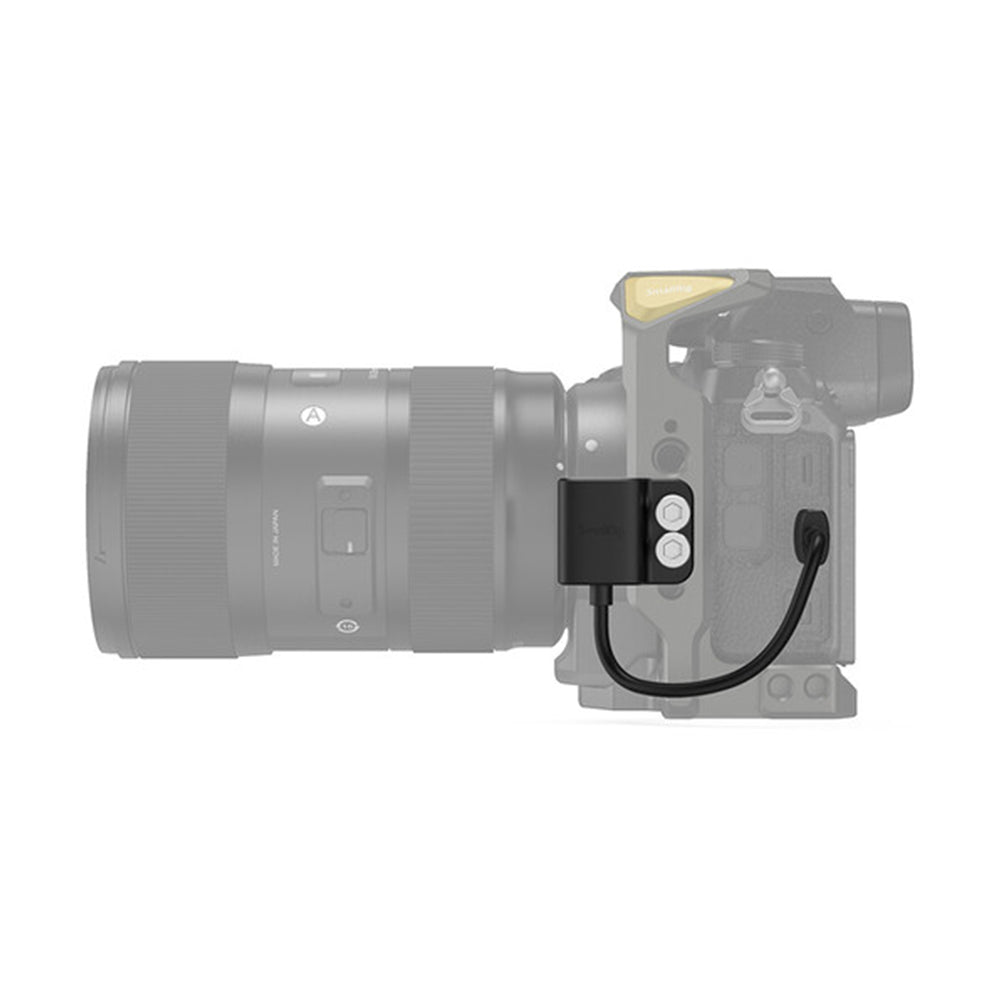The female end of the adapter cable features two 1/4"-20 threads to attach to a cage, bracket, or rig, and the threads measure 0.35" apart from center-to-center. Two screws are included to mount the adapter onto your rig. This flexible, ultra-slim PVC cable measures only 0.1" in diameter and measures 5.6" in length. Read more below about compatibility options.