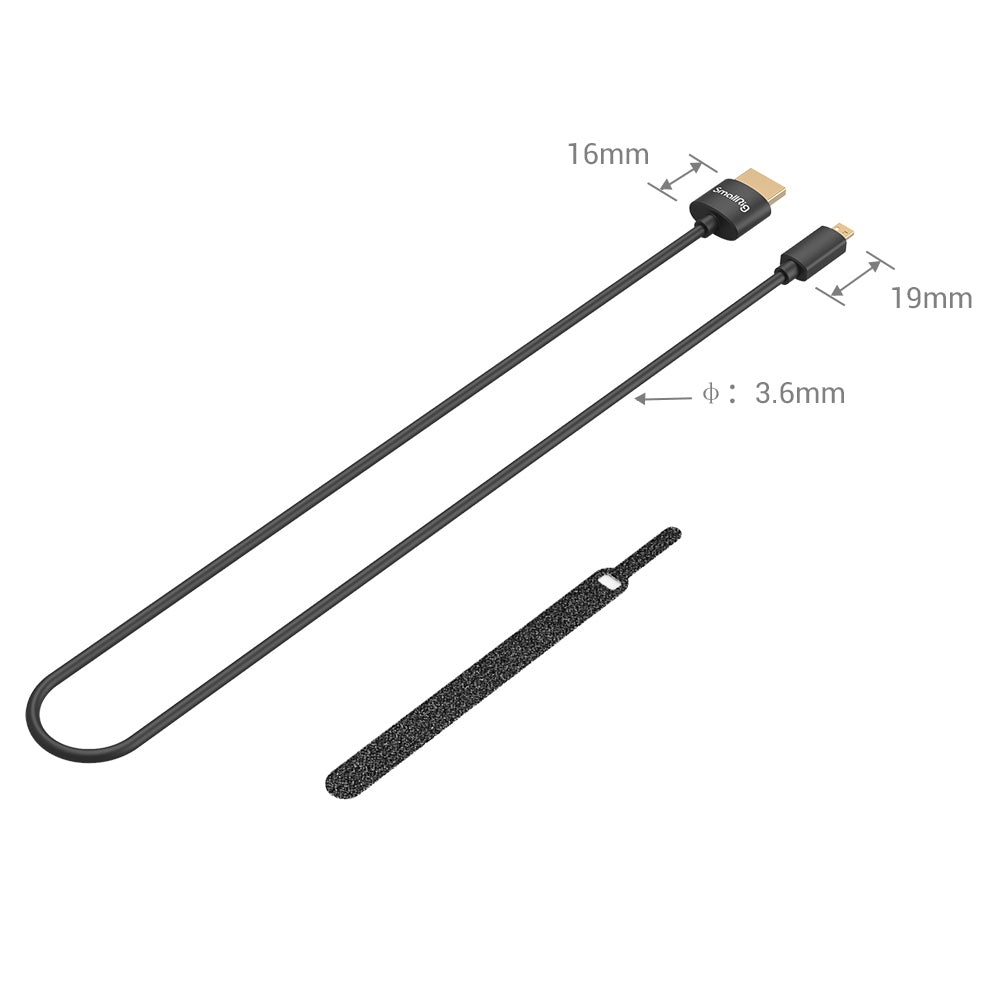- SmallRig Ultra Slim 4K cable (C to A) (D to A) 35cm & 55mm is a high-quality cable (Mini-Sized Ports to Full-Sized Ports) (Micro HDMI to Full HDMI) specially designed for your camera rig. It’s ultra-slim 2.0 version and supports resolution up to 4K@60HZ and will be backward compatible. Ultra-slim design with 3.6mm outer diameter makes it thinner and softer than a regular cable. Low-profile connectors will not block the adjacent ports. It’s a perfect cable for your camera rig with a 35cm cable length. The enclosed cable tie for cable management will help make your rig neat.