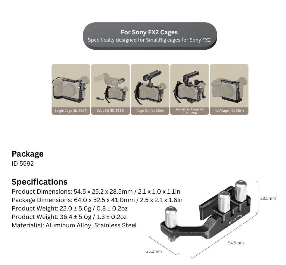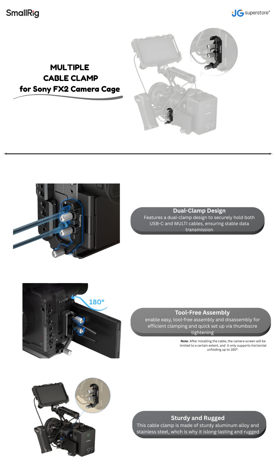The USB-C/HDMI/Multi Cable Clamp from SmallRig attaches to your Sony FX2 camera cage and secures your HDMI, USB-C, and Multi cable connections to ensure reliable data transfer. The clamp has a tool-free assembly thanks to its three integrated 1/4"-20 thumbscrews.