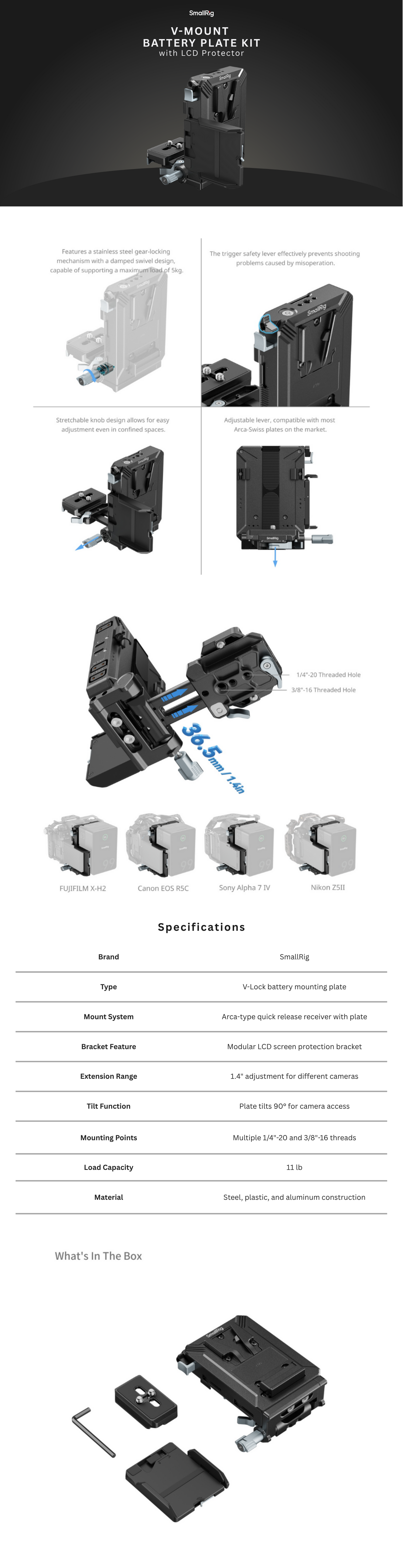 Add a compact, lightweight camera mounting and battery plate system to your rig with the Pro Adjustable Arca-Type Plate and V-Lock Battery Mounting System from SmallRig. This modular, folding plate system is designed for mirrorless cameras, and it also accommodates cameras with rear flip displays. This system consists of a V-lock battery plate, an Arca-type receiver, an Arca-type quick release plate, and a modular LCD screen protection bracket that can support a camera rig weighing up to 11 lb.