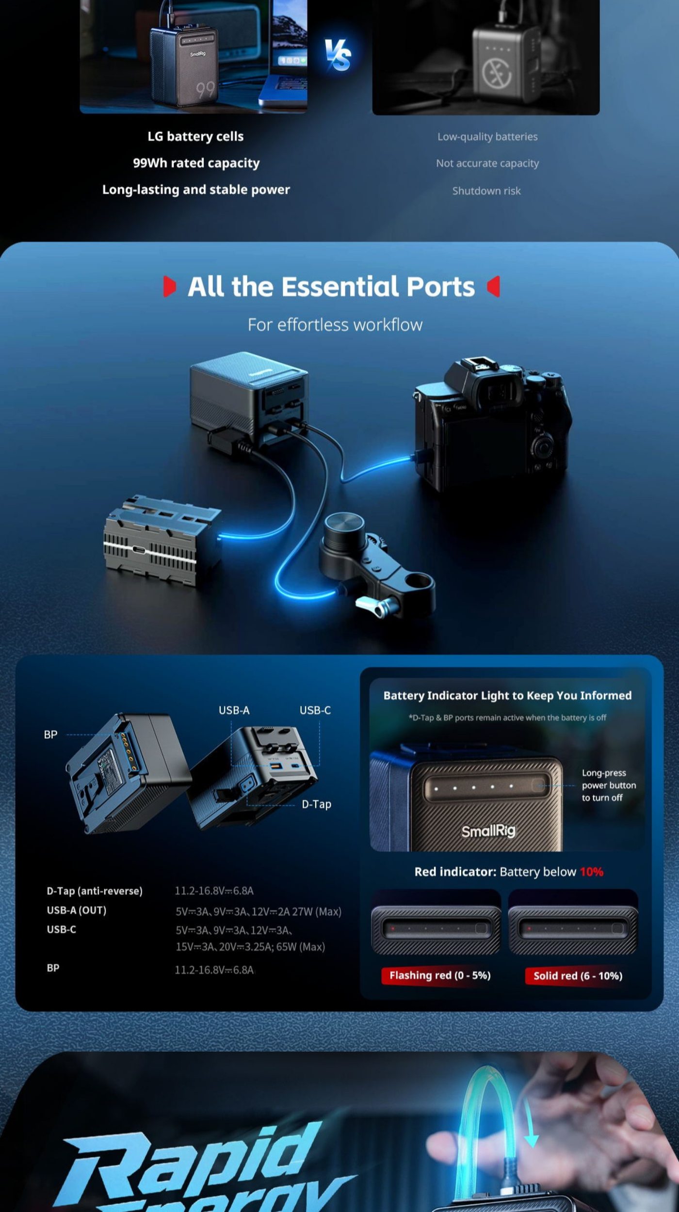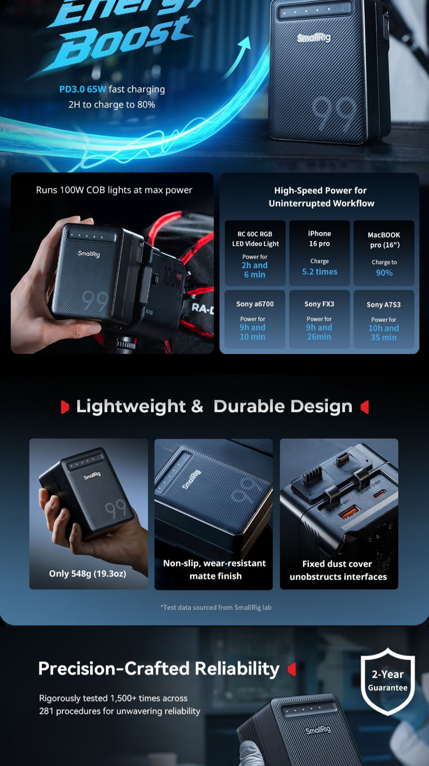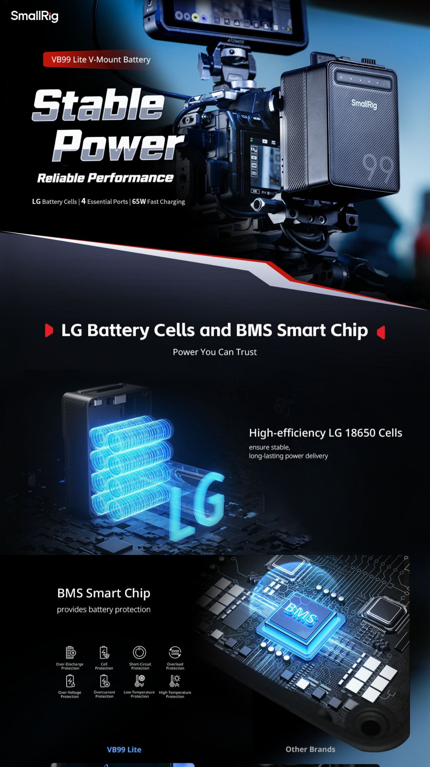 SmallRig VB99 Lite Power Bank 5245 is equipped with top-tier LG battery cells, delivering stable, true-rated high power output throughout the charge cycles. Featuring an advanced BMS chip with 8-layer protection, it continuously monitors current, voltage, and temperature, ensuring the safety of both the battery and connected devices.