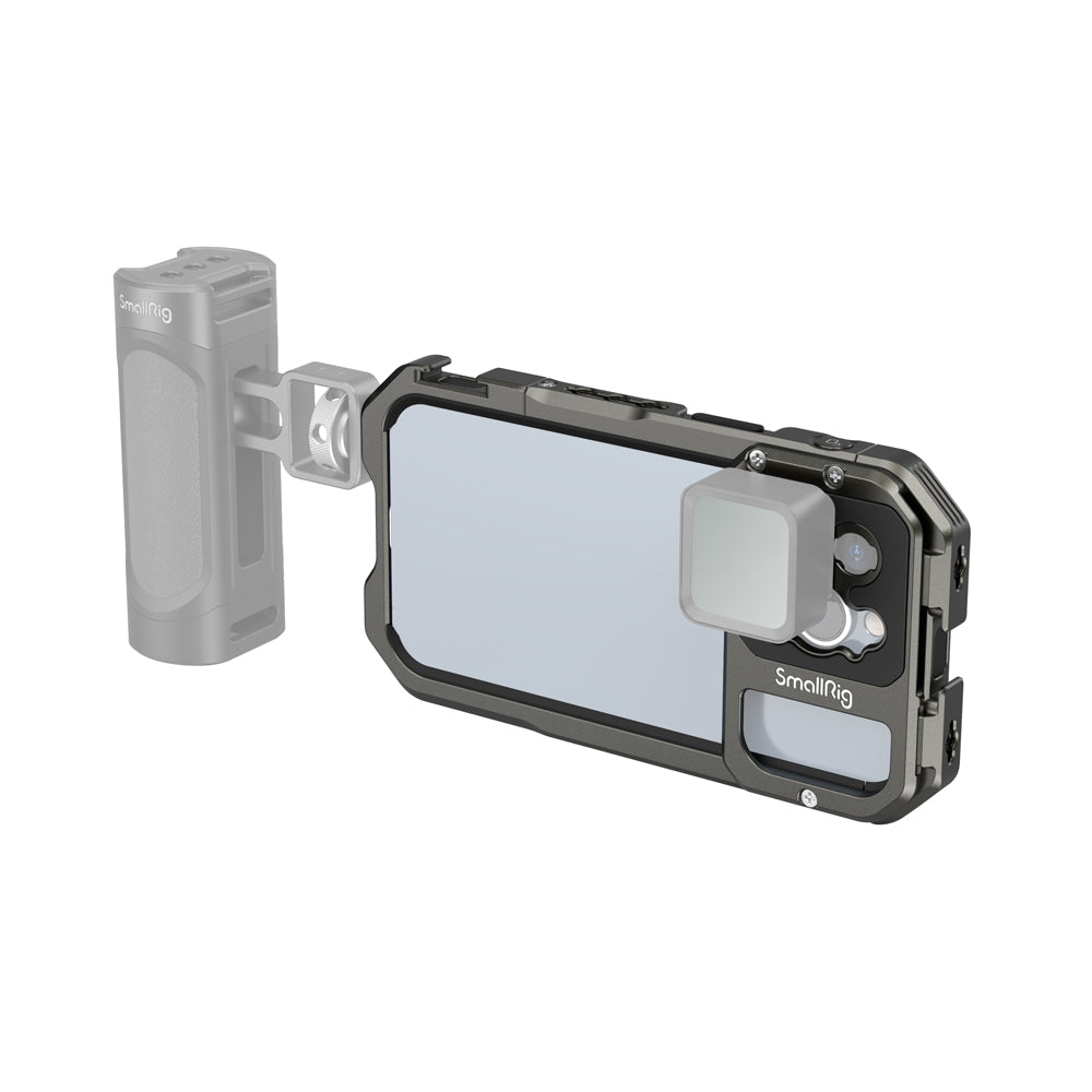 In order to build a high quality mobile shooting rig you have to start with a solid foundation, such as the Mobile Video Cage for iPhone 13 Pro from SmallRig. This durable aluminum alloy cage securely holds your uncased iPhone 13 Pro in place with its locking design to provide protection to your device via a soft interior and supplies a plethora of accessory possibilities. It does this without blocking lenses and sensors while maintaining access to buttons, ports, and wireless charging capabilities.