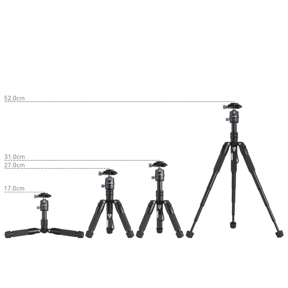 The SmallRig Aluminum Mini Tripod VT-20 4289 is a compact, versatile tripod ideal for compact DSLRs, mirrorless cameras, smartphones, and action cameras. It features foldable aluminum alloy legs and a center column for easy storage, measuring just 18cm (7 inches) in length and weighing under 700g (1.5lbs). The tripod's 5-section legs and quick tightening mechanism allow for height adjustments from 17cm (6.7 inches) to 52cm (20 inches).
