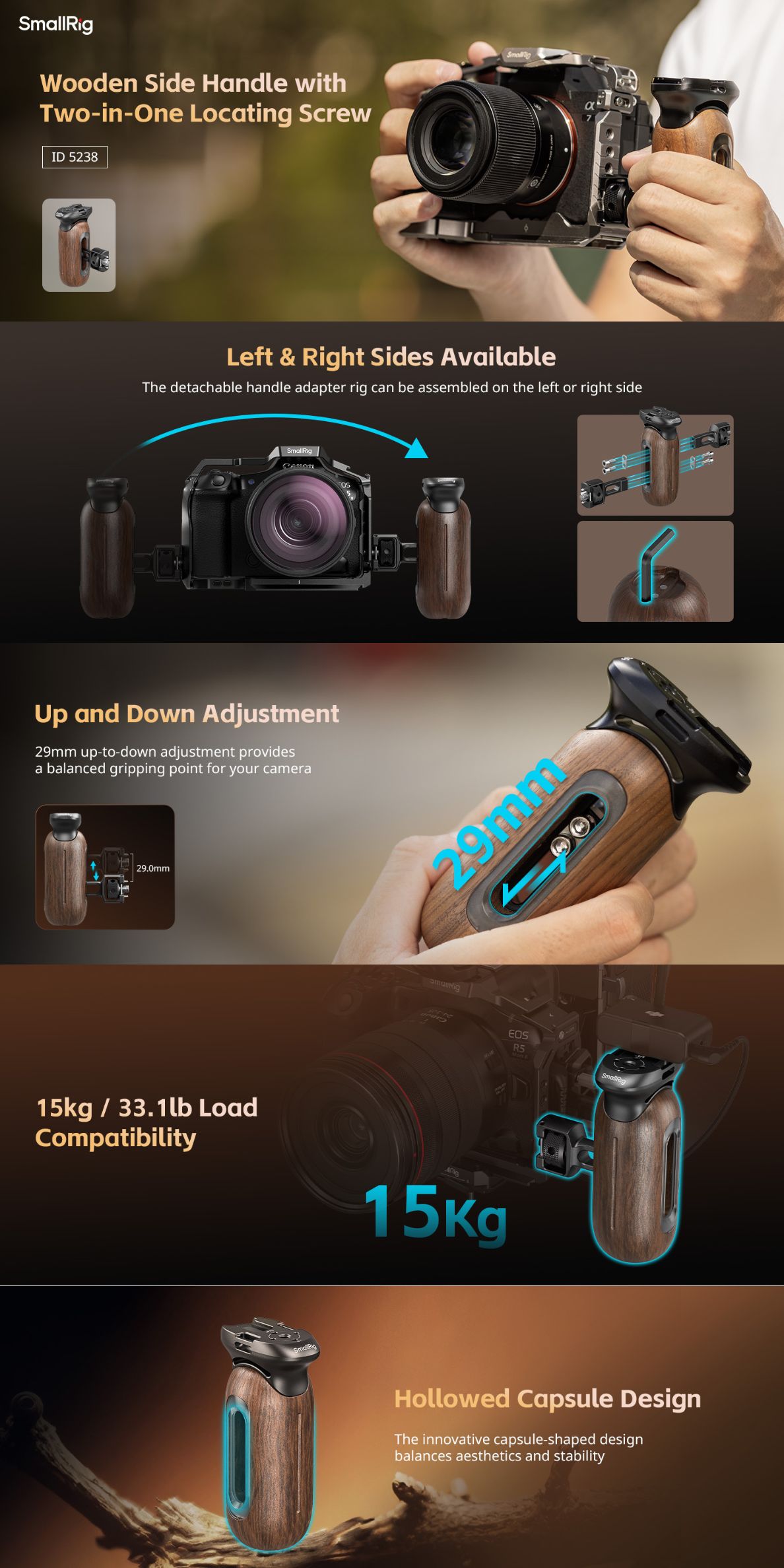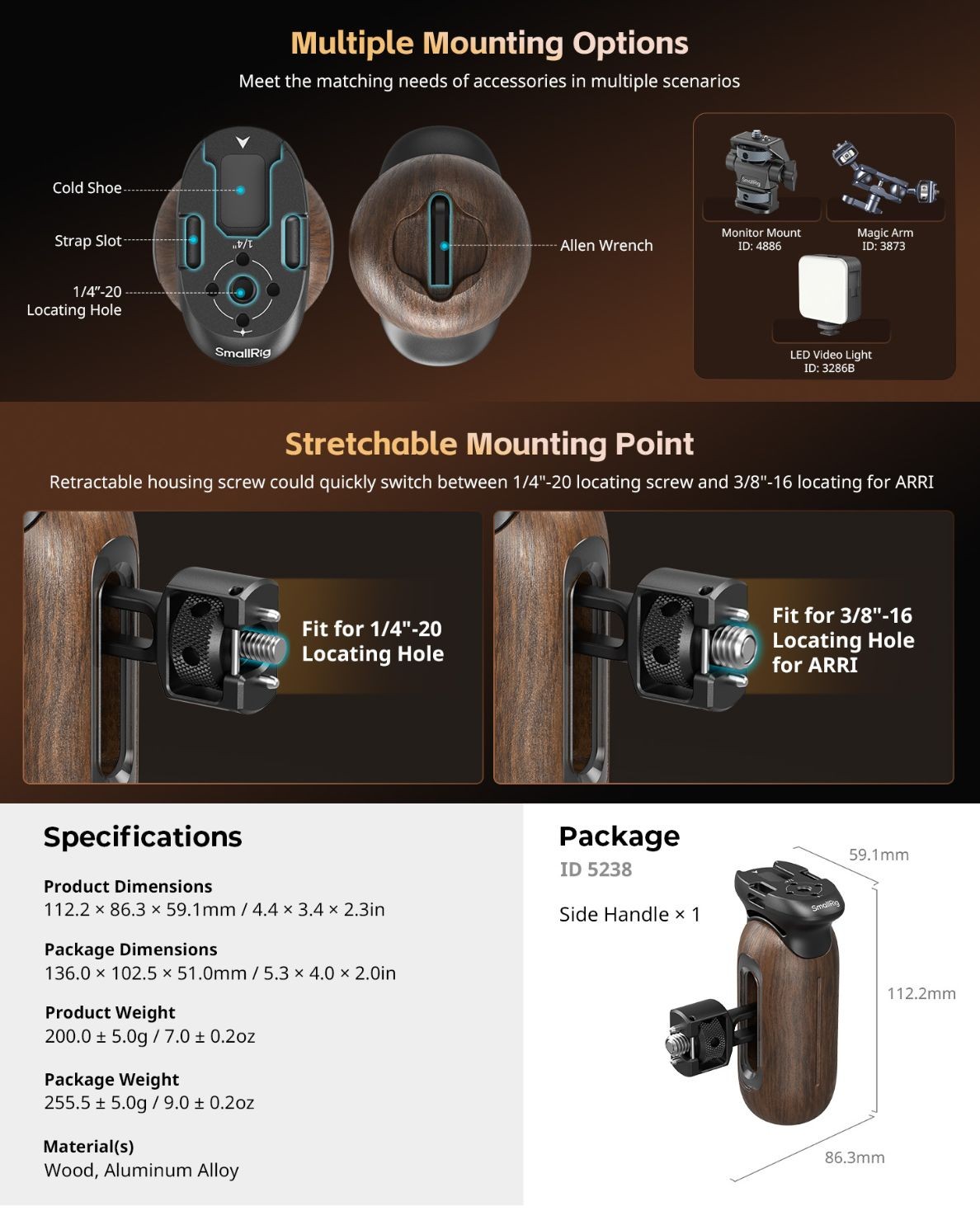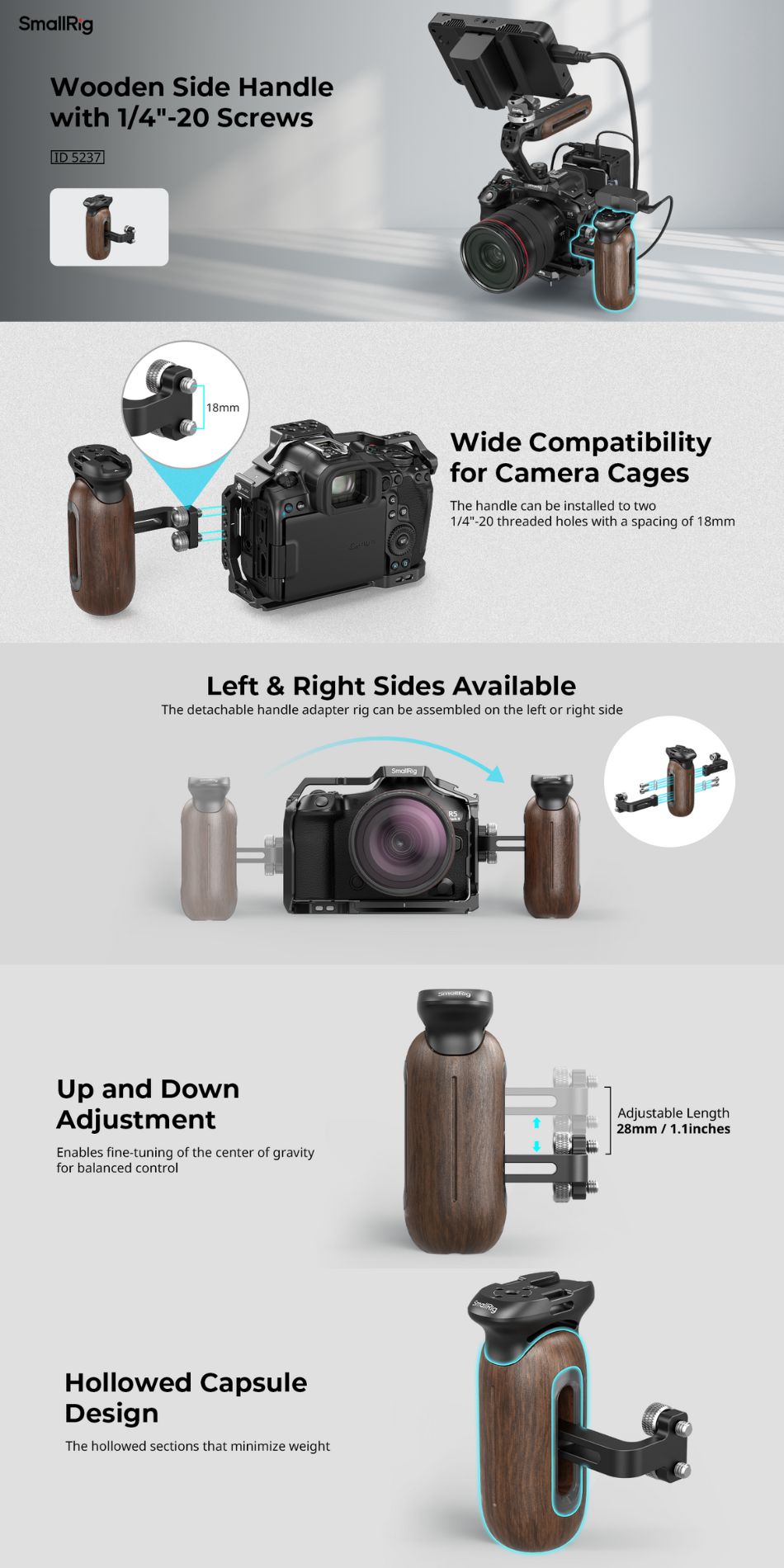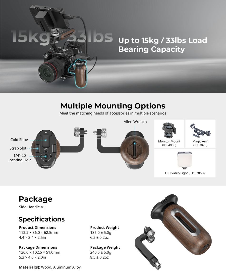 The SMALLRIG Wooden Side Handle with NATO Clamp is designed to enhance the comfort and stability of your camera setup, allowing for a more secure grip and smoother operation. Whether you’re shooting handheld or need additional control for more complex setups, this handle provides the perfect solution.