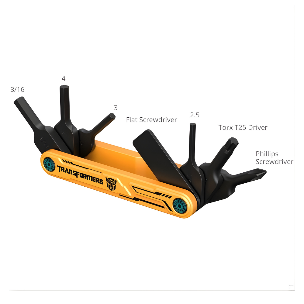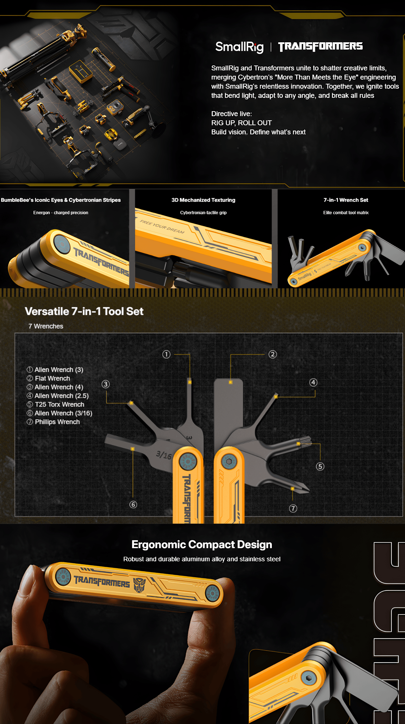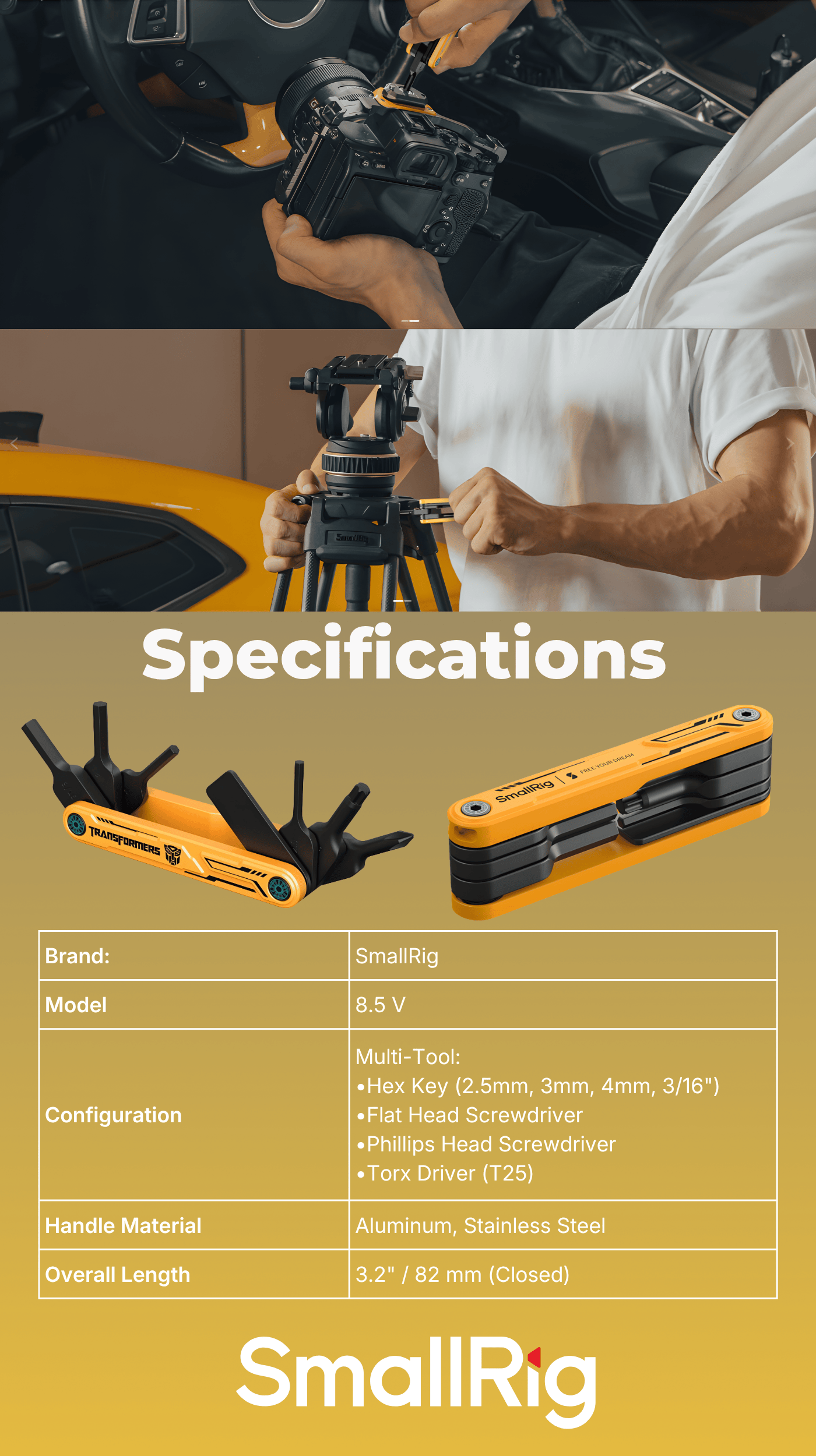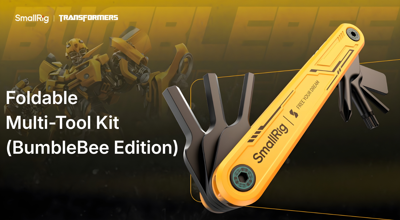 The Bumblebee Edition SmallRig Foldable Multi-Tool Kit is compact and easy to carry, yet packed with essentials for creators. It includes 2.5mm, 3mm, 4mm, and 3/16" Allen wrenches, one T25 Torx driver, one flathead screwdriver, and one Phillips screwdriver. The aluminum handle also features M2.5, M3, M4, M5, and 1/4 threaded holes for storing spare screws.