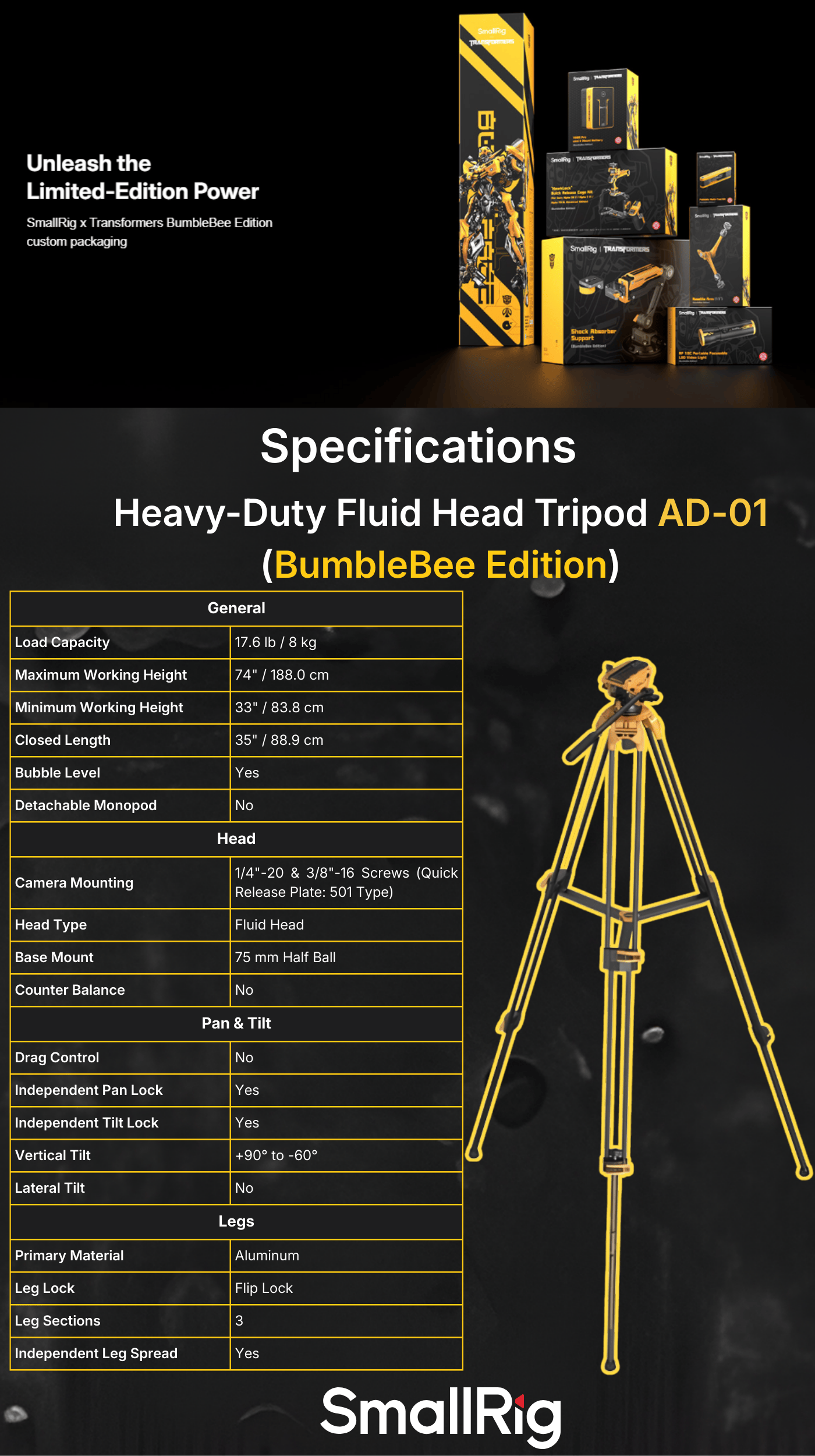 With a 17.6 lb load capacity at a weight of only 8.4 lb, the AD-01 Heavy-Duty Tripod with Fluid Head Bumblebee Edition from SmallRig is a durable and portable support option for professional photographers, videographers, and vloggers. The three-stage tripod is constructed with durable, lightweight aluminum and features a 33 to 74" adjustable height range and easy flip locks.