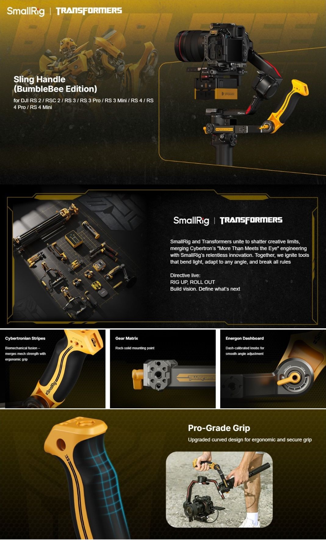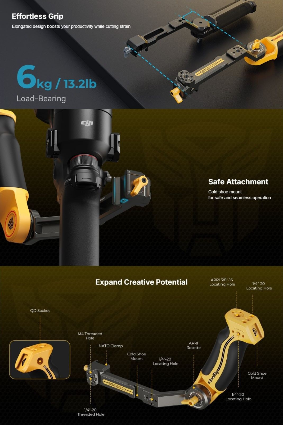 Capture low-angle shots with your gimbal using the Bumblebee Edition Sling Handle from SmallRig. Designed to work specifically with the DJI RS 2, RSC 2, RS 3, RS 3 Pro, RS 3 Mini, RS 4, RS 4 Mini, or RS 4 Pro, this handle boasts multiple 1/4"-20 threads, ARRI anti-twist 3/8"-16 threads, two cold shoe mounts, and a NATO rail with locating pin. The angle of the handle may be adjusted to 180° via a ratchet knob, allowing it to be employed as a side handle, and the curved grip is protected with anti-slip silicone.