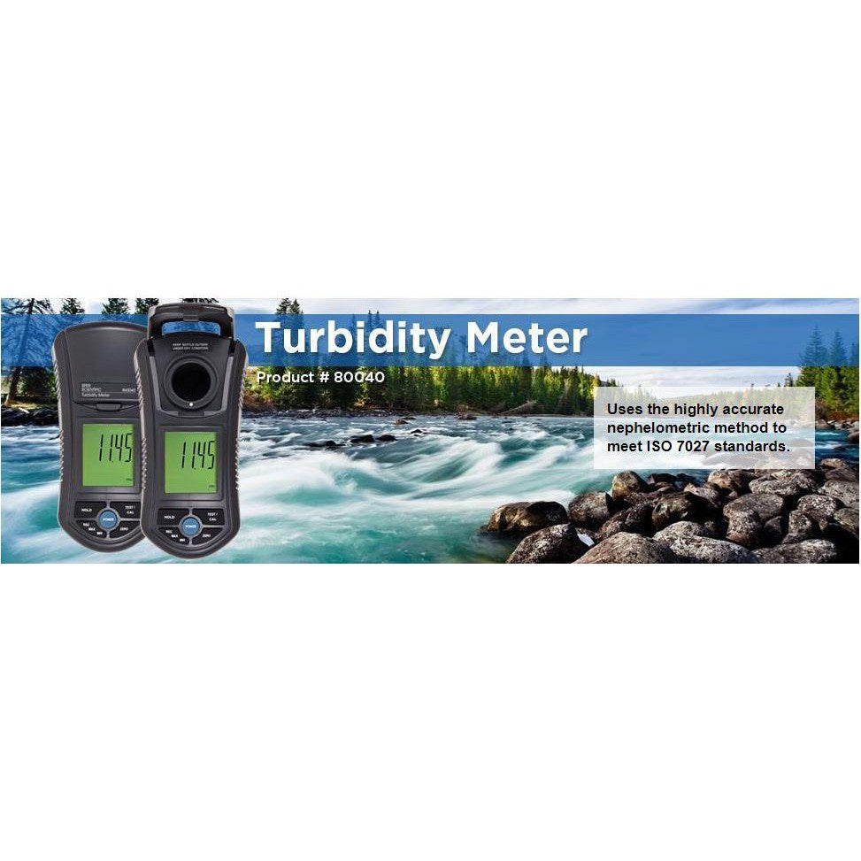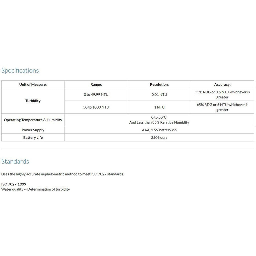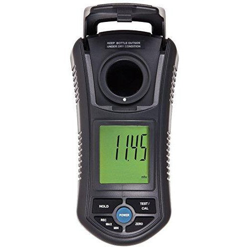 Turbidity (undissolved solids) is an important measure of water quality in environmental testing, wastewater, petrochemical, beverage industry, and electroplating. This compact, battery operated meter is easily portable for use in the field or lab. Uses the highly accurate nephelometric method to meet ISO 7027 standards. Features push-button automatic 2-point calibration, auto-ranging, and min-max recall, Light Source: LED, 850 nm. Comes ready to use in a hard, foam lined, carrying case with 0 NTU and 100 NTU calibration solutions, 2 sample cell bottles, distilled water, cleaning cloth, instruction manual, and 6 AAA batteries.